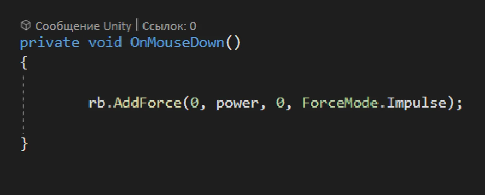 - ForceMode.Impulse — кратковременное воздействие, например, удар или взрыв.