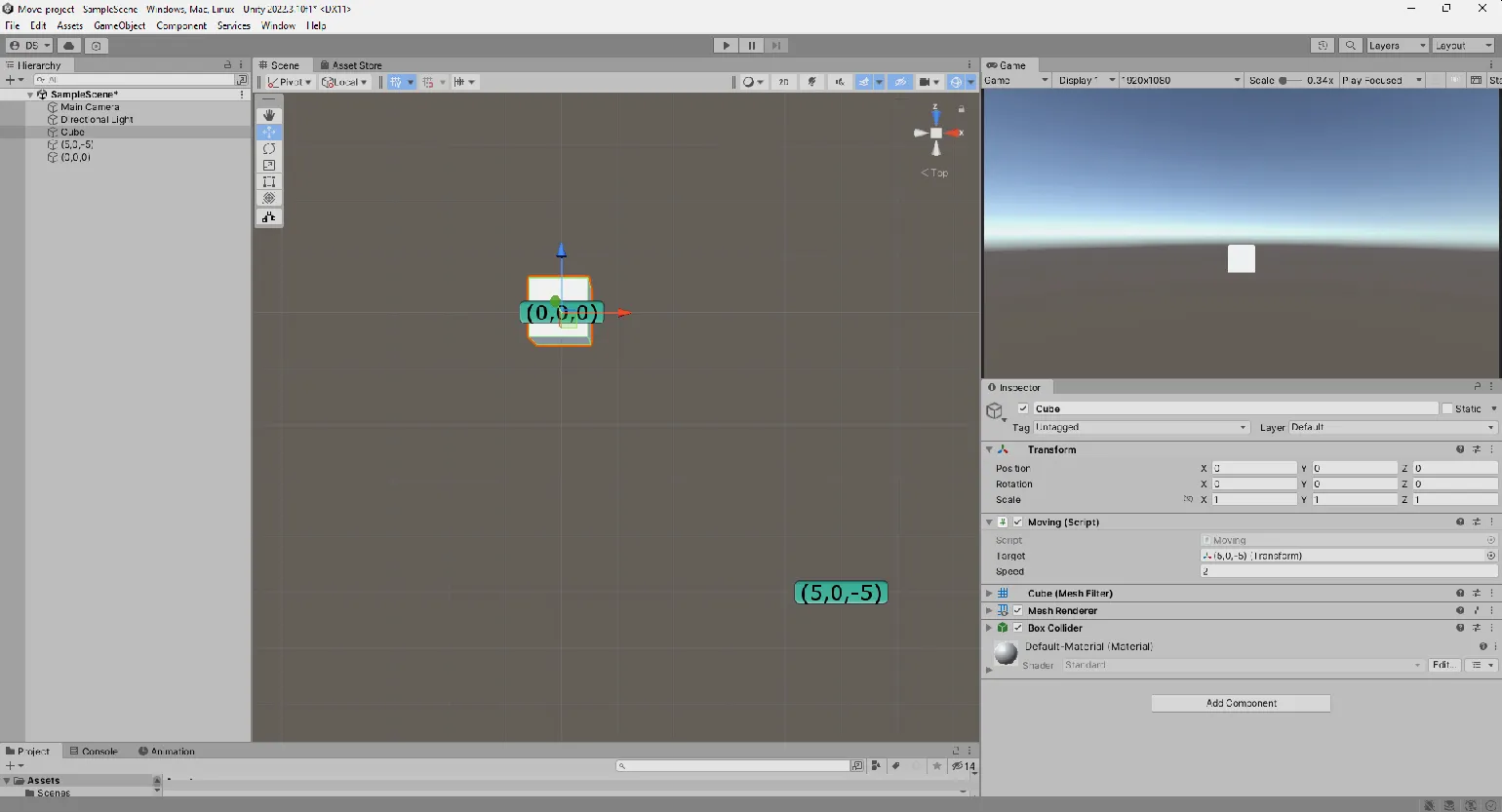 В данной сцене присутствуют три объекта: куб, который будет перемещаться, и два невидимых целевых объекта. Первая цель располагается в точке с координатами (0, 0, 0), а вторая — в точке (5, 0, -5). Наша задача заключается в том, чтобы переместить куб из его начального положения к координатам второй цели (5, 0, -5) с заданной скоростью перемещения 0.1. Такой подход позволяет эффективно управлять движением объектов в трехмерной среде, что особенно важно для разработки игр и анимаций.