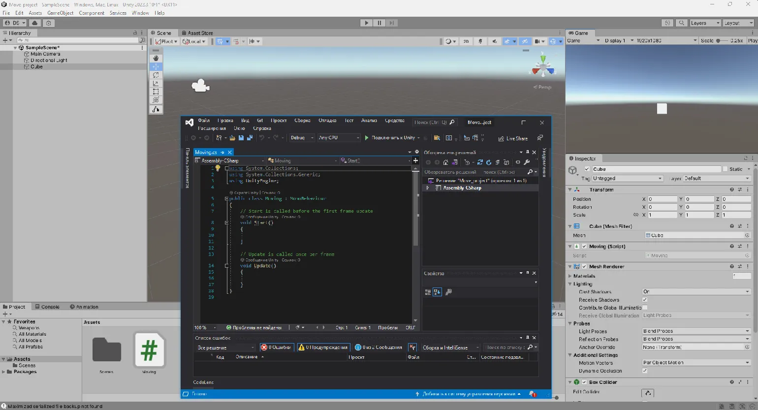 Сначала выделите куб в сцене и перетащите созданный файл «Moving» в окно Inspector этого куба. Это действие позволит кубу выполнять все команды, прописанные в скрипте. После этого откройте файл «Moving» для редактирования и внесите необходимые изменения.