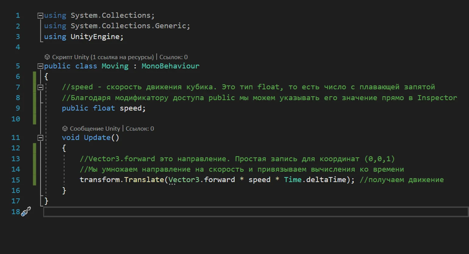 Для использования метода transform.Translate в Unity код будет выглядеть следующим образом: