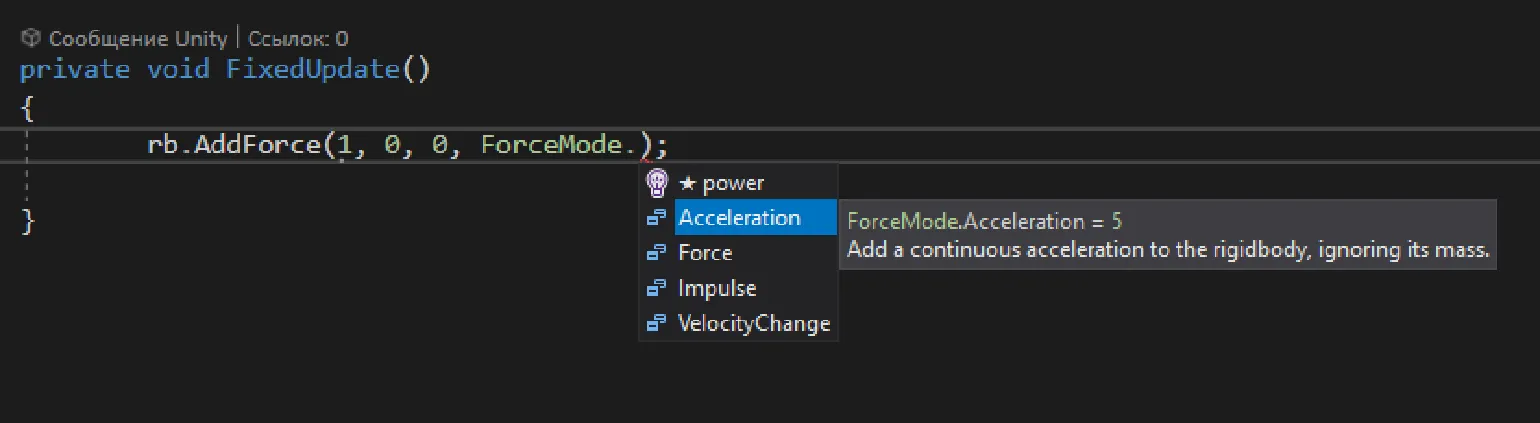 - ForceMode.Acceleration — аналогичен ForceMode.Force, но масса не учитывается.