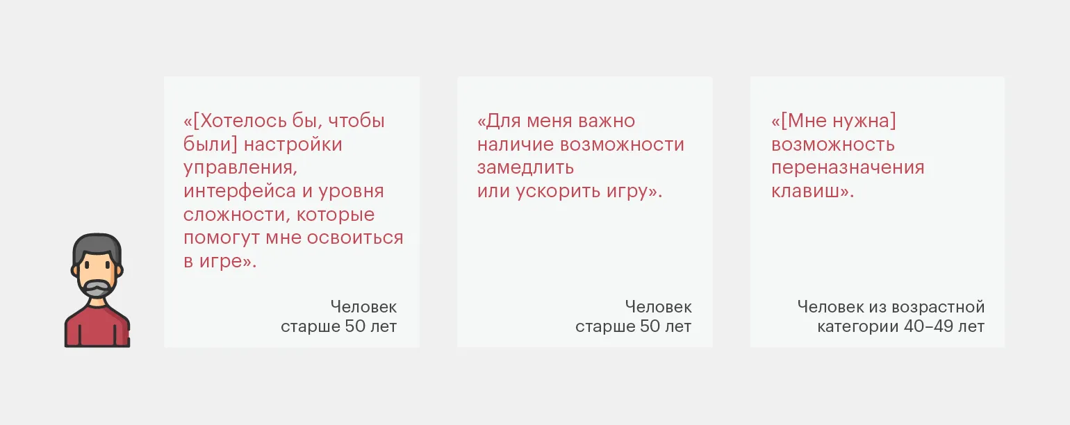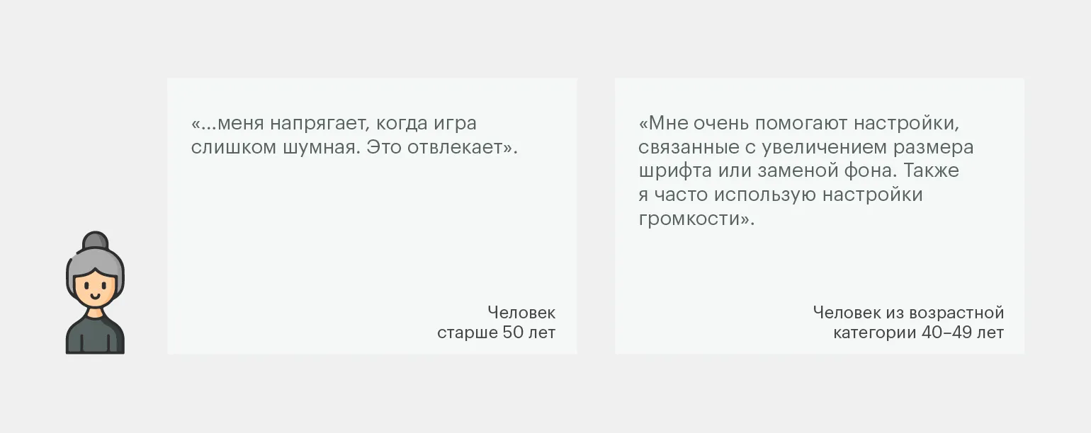 Разработчикам, незнакомым с особенностями возрастной аудитории, может показаться, что для создания игр для этой группы достаточно сосредоточиться на геймдизайне, ориентированном на людей с ограниченными возможностями. Однако такой подход может усугубить существующие стереотипы о старости, что негативно скажется на популярности игр и их охвате. Кроме того, не все специализированные возможности соответствуют потребностям пользователей старше 50 лет. Чтобы создать востребованные и интересные игры для данной аудитории, необходимо учитывать не только физические ограничения, но и психологические, социальные и культурные аспекты, которые влияют на игровой опыт.