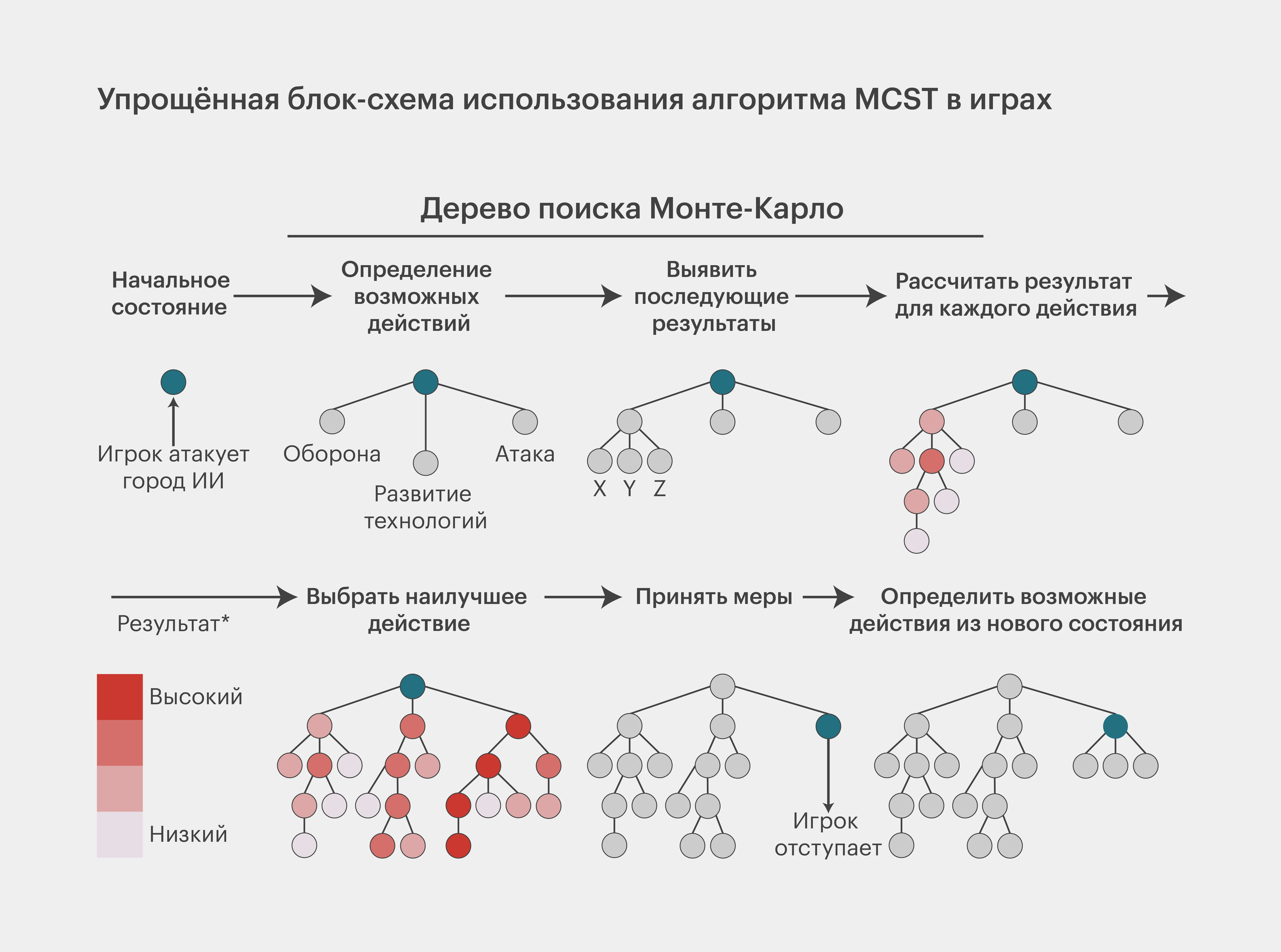 В стратегических играх, таких как Civilization, количество возможных сценариев значительно превышает шахматные партии. В таких условиях алгоритм MCTS (Монте-Карло деревья поиска) эффективно выбирает случайные ходы из множества вариантов. Это позволяет избежать чрезмерных вычислений и делает искусственный интеллект более адаптивным к различным игровым ситуациям. Использование MCTS в стратегических играх обеспечивает более гибкий и разнообразный подход к принятию решений, что, в свою очередь, повышает качество игрового процесса и делает его более увлекательным для игроков.