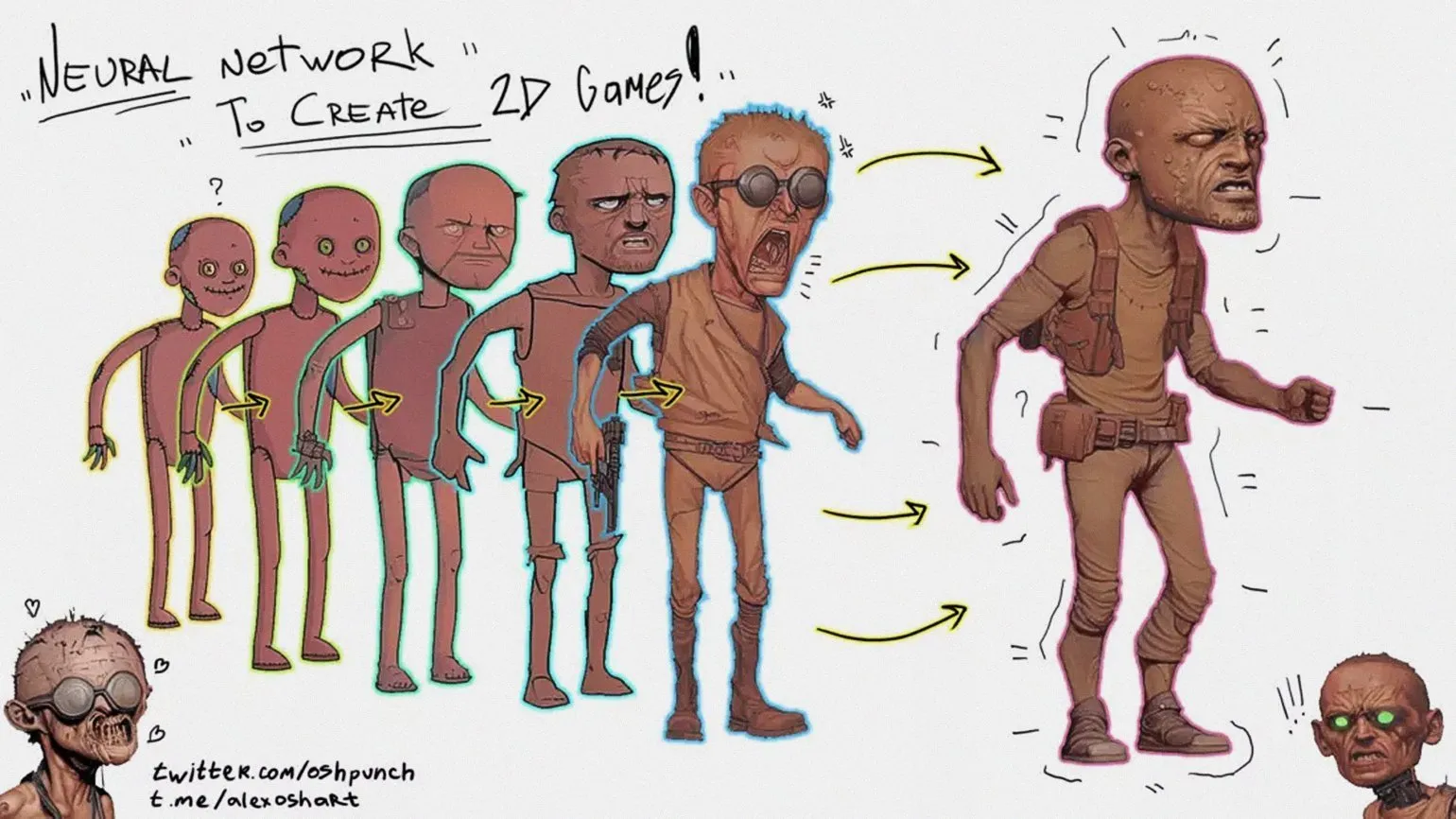 Osh Punch использовал нейросеть для создания 2D-модели персонажа, к которому затем добавил скелетную анимацию и интегрировал в игровой движок. Однако художник не ограничивался лишь работой с нейросетью: он использовал свои собственные наработки, дорабатывая детали и загружая обновленные версии обратно в систему. Этот процесс демонстрирует успешное сотрудничество между художником и нейросетью, что привело к выдающемуся результату.