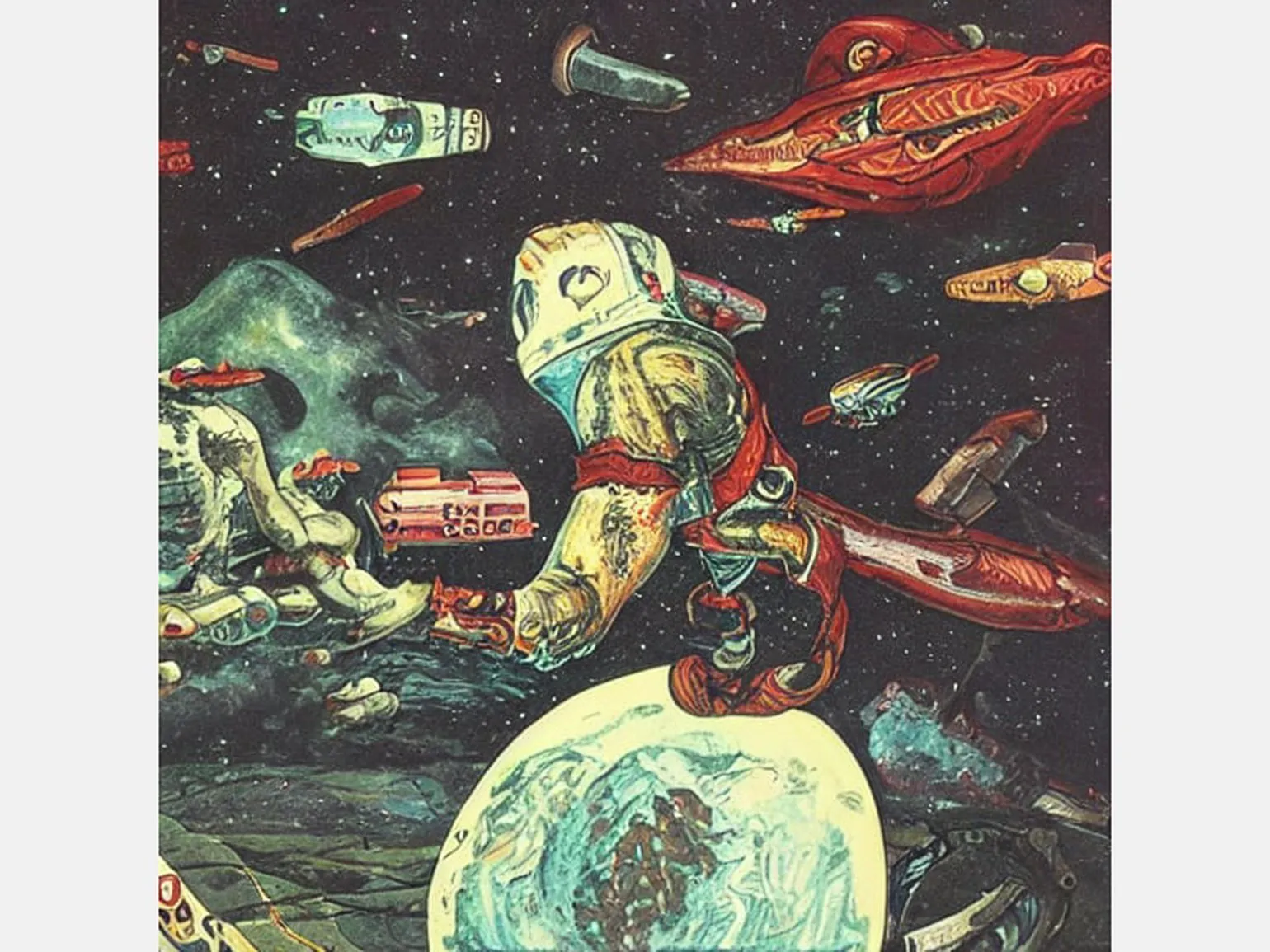Для завершения работы над астронавтом потребуется полностью доработать его самостоятельно. Кроме того, мне понадобилась летающая мясная рыба с диско-шаром на спине и готическая церковь с глазами. В этом процессе я собрал множество подходящих референсов, которые помогут в создании уникального и запоминающегося визуального образа.