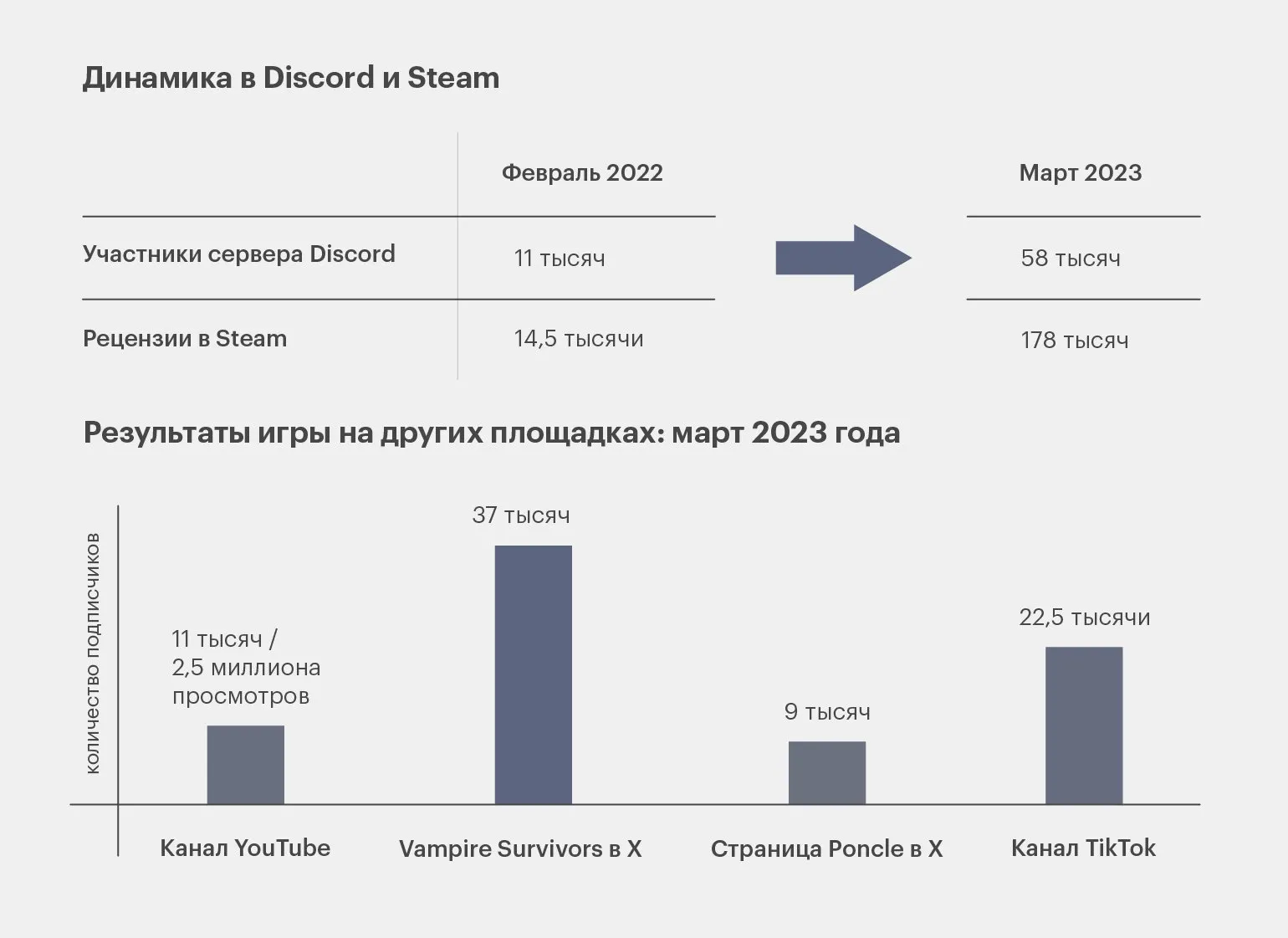 В случае с Vampire Survivors Бет продемонстрировала впечатляющие результаты: с февраля 2022 года по март 2023 года количество участников сервера в Discord увеличилось с 11 тысяч до 58 тысяч. В этот же период игра заняла второе место в Steam по количеству рецензий, достигнув 178 тысяч обзоров, при этом общий рейтинг остается на уровне «Крайне положительный». Такие достижения подчеркивают растущую популярность Vampire Survivors и активное участие сообщества.