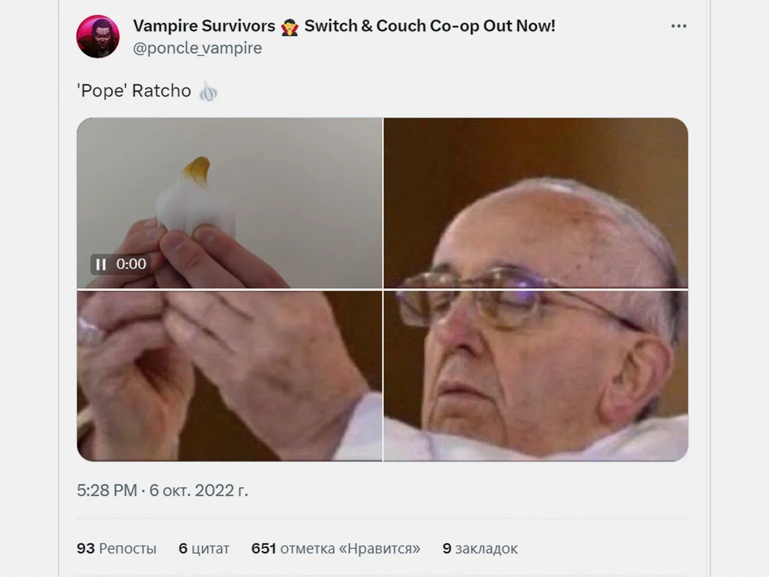 - Узнайте, что нравится аудитории. Так, фанатам Vampire Survivors особенно полюбились персонаж По Ратчо и его базовое оружие, чеснок. Соответственно, Бет стала постить больше мемов с их участием, потому что пользователи охотно лайкают и делятся этими публикациями.