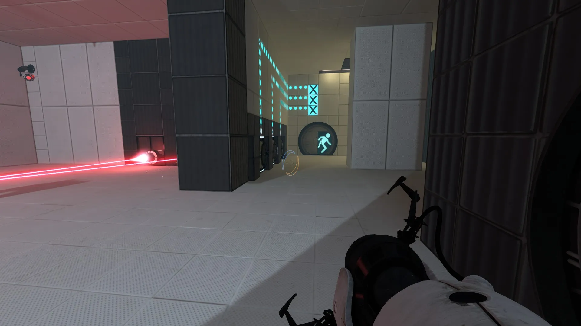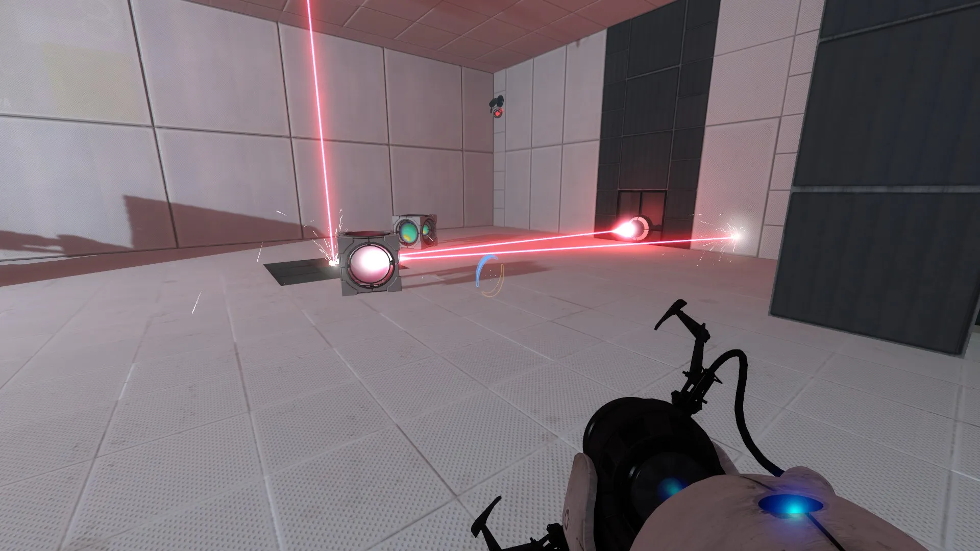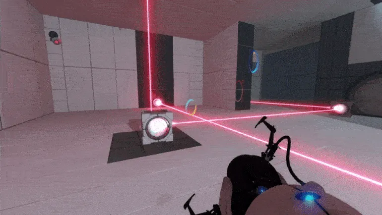 В данной ситуации очевидно, что необходимо либо увеличить количество порталов, либо использовать больше кубов-призм. Это связано с тем, что для направления одного луча на приемник потребуется два куба, что создает определенную сложность. Автор уровня, безусловно, предвидел, какое решение вы можете попытаться реализовать.