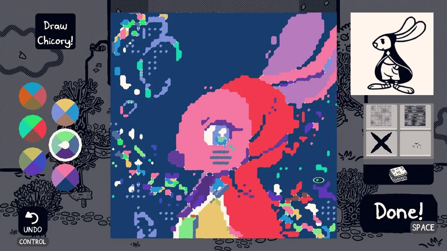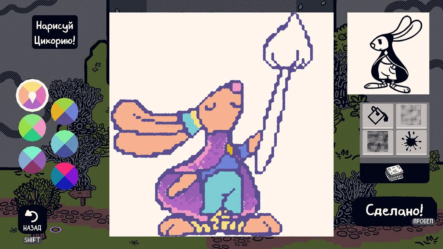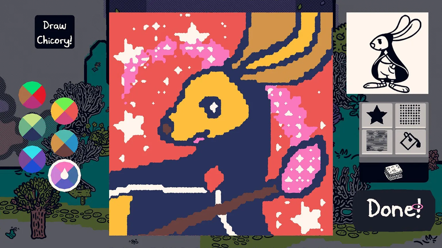 В отличие от многих других проектов, где рисование является второстепенным занятием и не всегда включает идею самовыражения, в игре Chicory свободное творчество занимает центральное место. Во время разработки Грег сформулировал ряд принципов, которые позволили ему естественно интегрировать рисование в игровую механику и создать мотивацию для игроков.