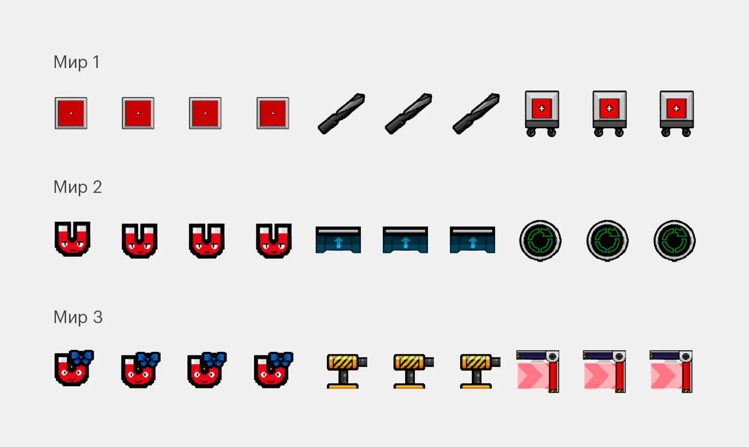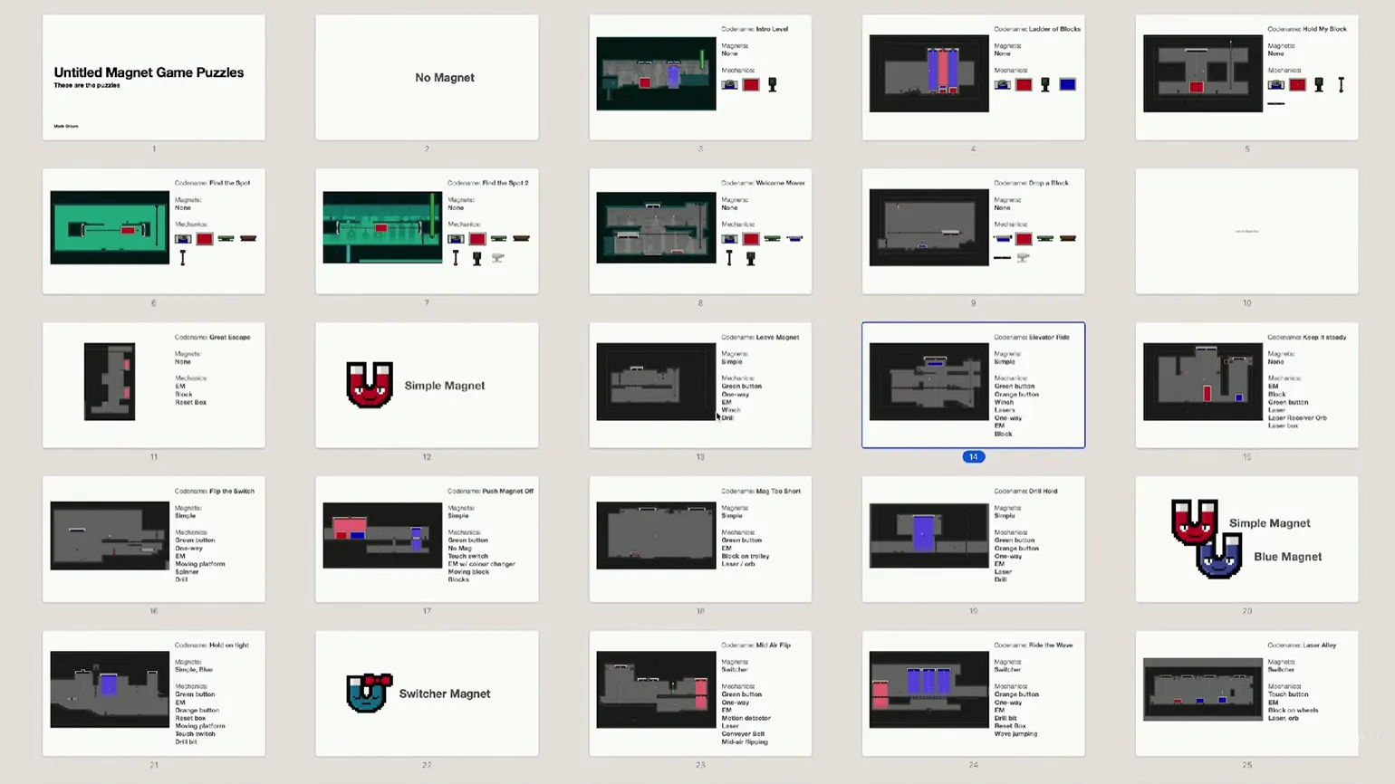 Пазлы в различных мирах посвящены разнообразным типам магнитов. В своем видео Марк подробно рассказал о первых трех из них. Первый мир включает только магнитные блоки. Во втором мире появляется Макс, базовый магнит, который служит основой для понимания механики игры. В третьем мире представлена Мэгги, или Мэг, магнит с уникальной особенностью — раздвоением личности, позволяющим ей менять полярности. Разработчик планировал выделить по четыре уровня для знакомства с каждым из этих персонажей в каждом мире, что позволяет игрокам глубже понять их способности и взаимодействие в игровом процессе.