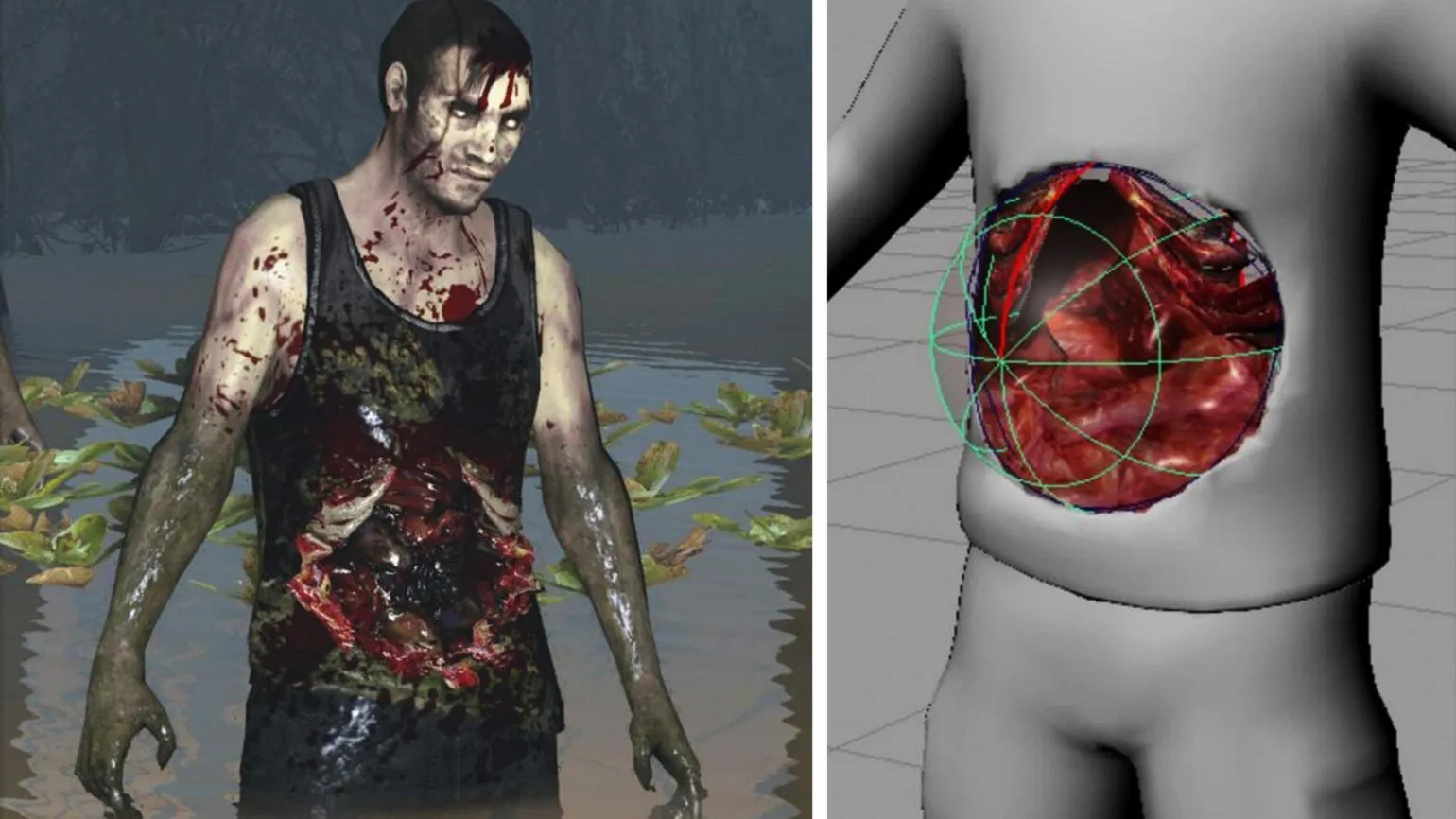 Для заполнения образовавшейся дыры в модели использовалась специальная заплатка, имитирующая окровавленные внутренности и кости. Эта инновационная технология позволила разработчикам создать 54 уникальных увечья на теле зомби, не требуя переработки существующих моделей. Такой подход улучшает визуальное восприятие и разнообразие персонажей, делая игровой процесс более захватывающим и реалистичным.