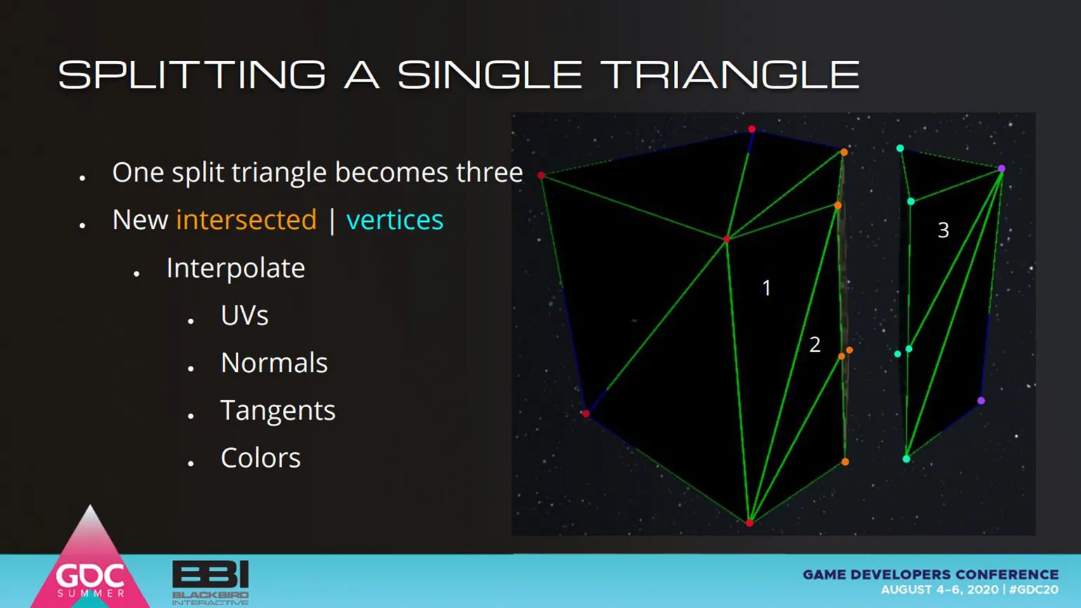 Вы распределяете вершины меша на две половины, а затем в области среза, который может проходить между вершинами, создаете новые вершины рёбер с помощью интерполяции. В результате у вас образуются два меша, которые визуально продолжают выглядеть как единое целое. Однако для завершения процесса необходимо сформировать поверхность среза. Эту поверхность можно создать, соединяя случайную рёберную вершину в области среза со всеми остальными рёберными вершинами.