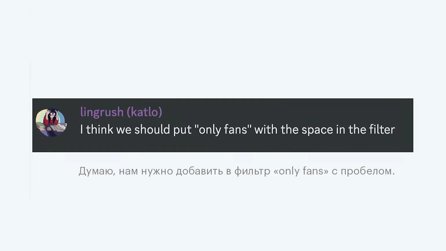 В чате, который модерировала команда Кэт, зрители столкнулись с проблемой, когда не могли упоминать название портала OnlyFans из-за его блокировки в автофильтре. В ответ на это они начали использовать альтернативный способ написания — разделяя слова и указывая «only fans». Модератор заметила эту тактику и предложила добавить данное словосочетание в список запрещённых слов, чтобы предотвратить обход фильтров.