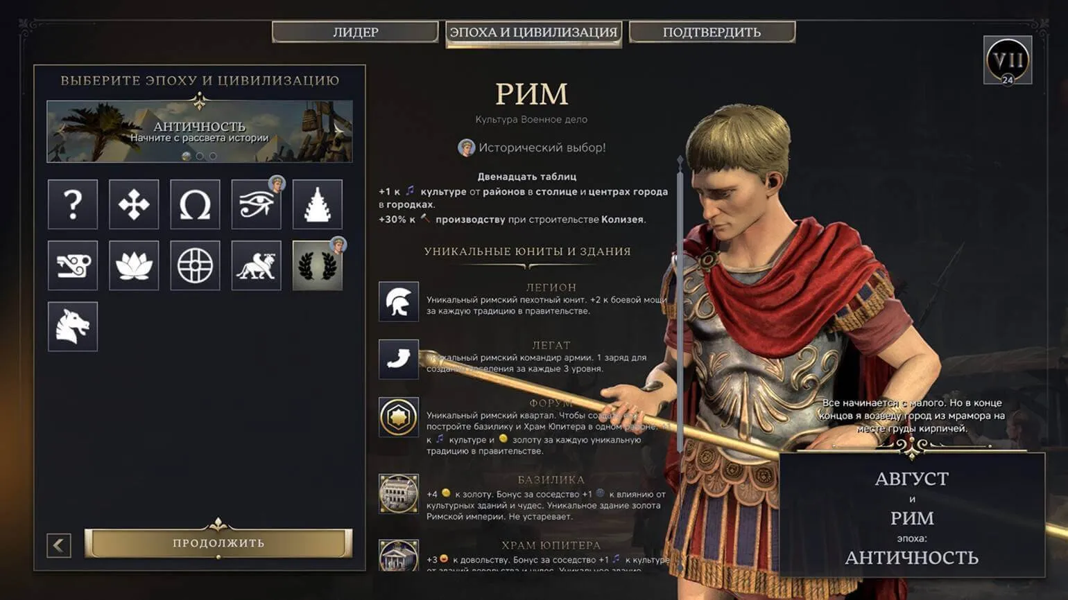 В данной игре цивилизации и их лидеры выбираются независимо друг от друга. Лидер больше не управляет одной и той же цивилизацией на протяжении всей партии, а совершает смену цивилизации на протяжении трех эпох: Античности, Эры Исследований и Современности. Это нововведение добавляет разнообразие в стратегию игры и позволяет игрокам адаптироваться к меняющимся условиям.