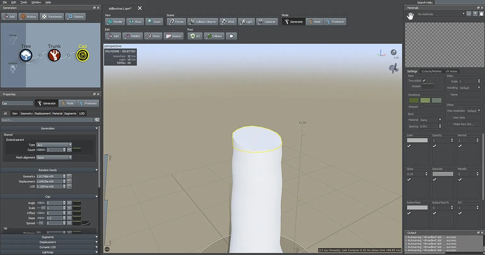 Ствол дерева по умолчанию представлен в виде трубчатого объекта. Если требуется добавить геометрию среза, необходимо щелкнуть правой кнопкой мыши на нод Trunk и выбрать пункт Add geometry to selected, затем Cap. Этот нод будет полезен при моделировании пня или спиленной верхушки дерева, позволяя создать более реалистичную визуализацию и детализированную геометрию.
