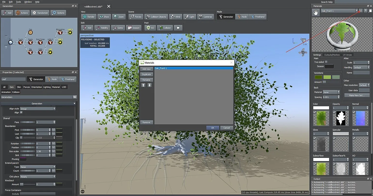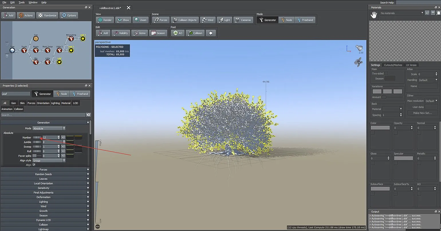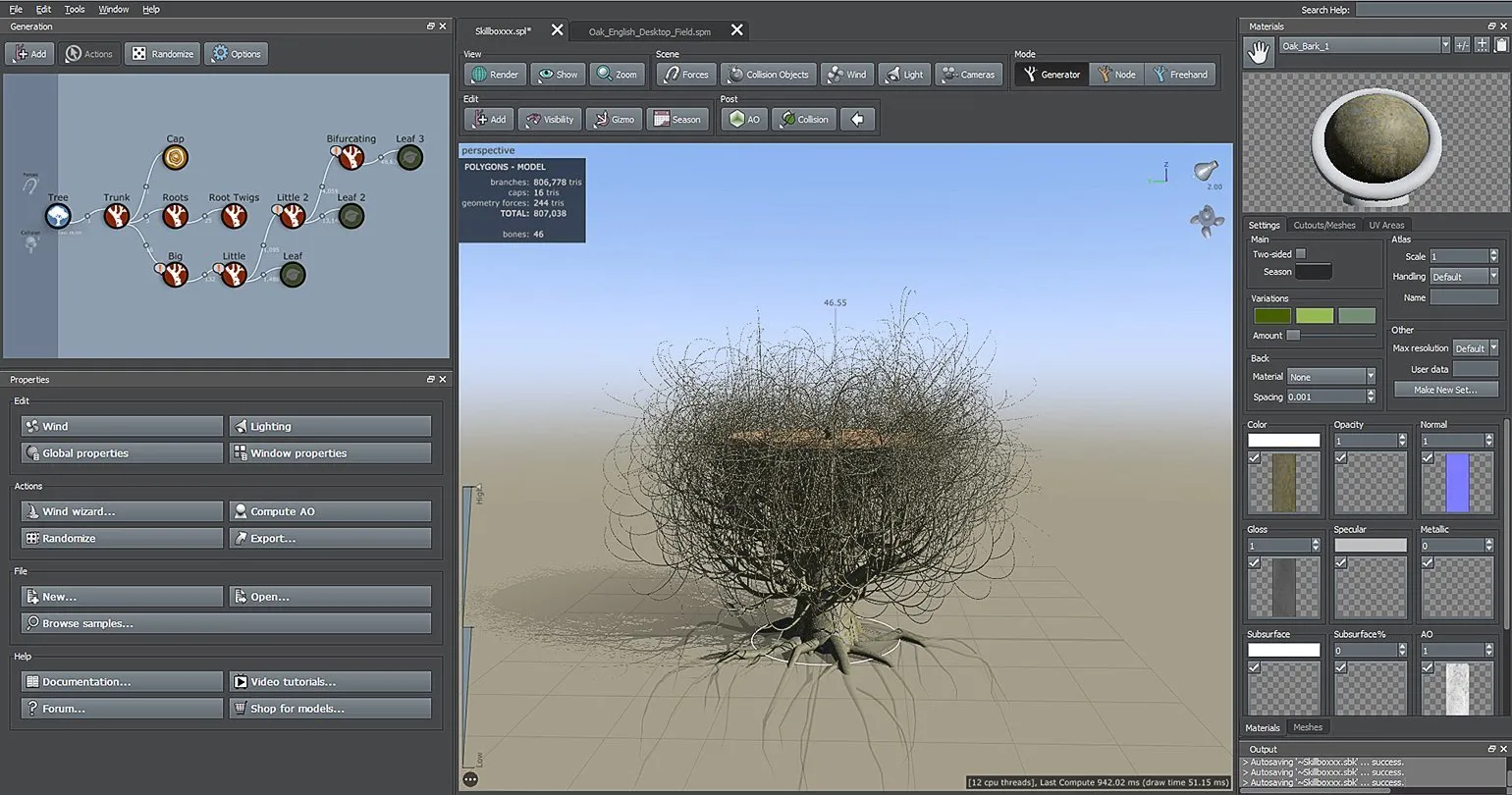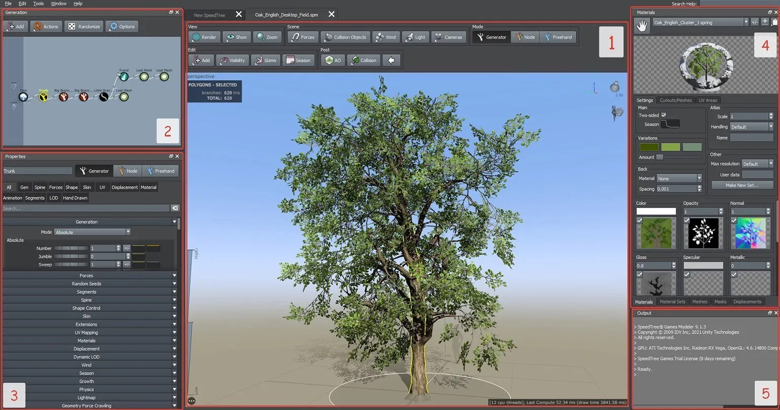 В центре интерфейса находится Tree Window (на скриншоте выше — окно №1), который представляет собой основной 3D-вьюпорт. В этом окне размещена панель инструментов, предназначенная для генерации и моделирования объектов, а также для настройки физики и рендеринга. Здесь также доступны функции настройки освещения и направления ветра, которые можно найти в правом верхнем углу вьюпорта. В левом нижнем углу расположена шкала уровня детализации объекта, позволяющая контролировать качество отображения.
