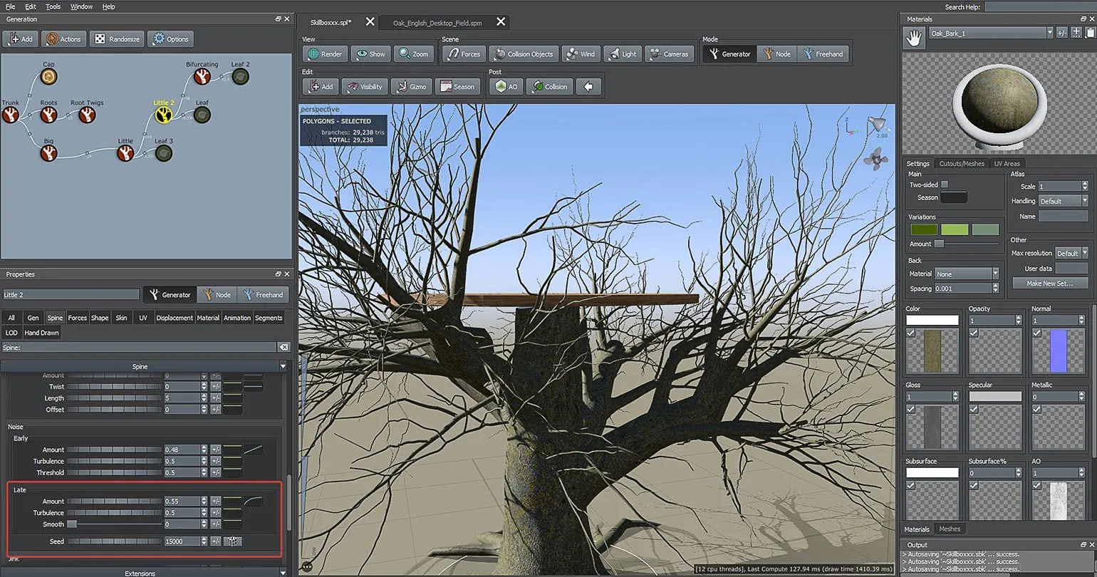 В верхнем левом углу располагается Generator Editor (окно №2). Это система генерации, в которой все элементы текущего дерева или другой растительности представлены в виде узлов и организованы в логическую цепочку роста. При выборе конкретного узла, часть объекта, связанная с этим фрагментом, выделяется жёлтым цветом в вьюпорте. Например, на представленном скриншоте выделен узел ствола (Trunk).