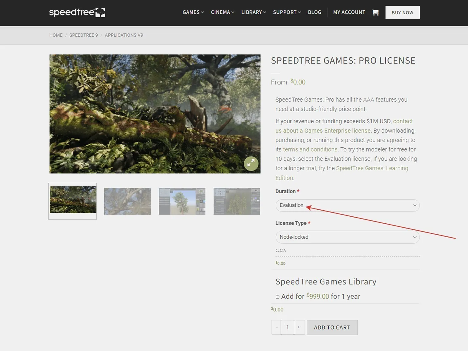 Чтобы оформить Pro-версию на 10 дней, во вкладке Duration нужно выбрать пункт Evaluation Источник: официальный сайт SpeedTree