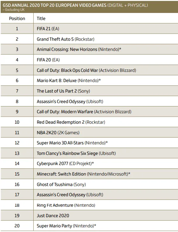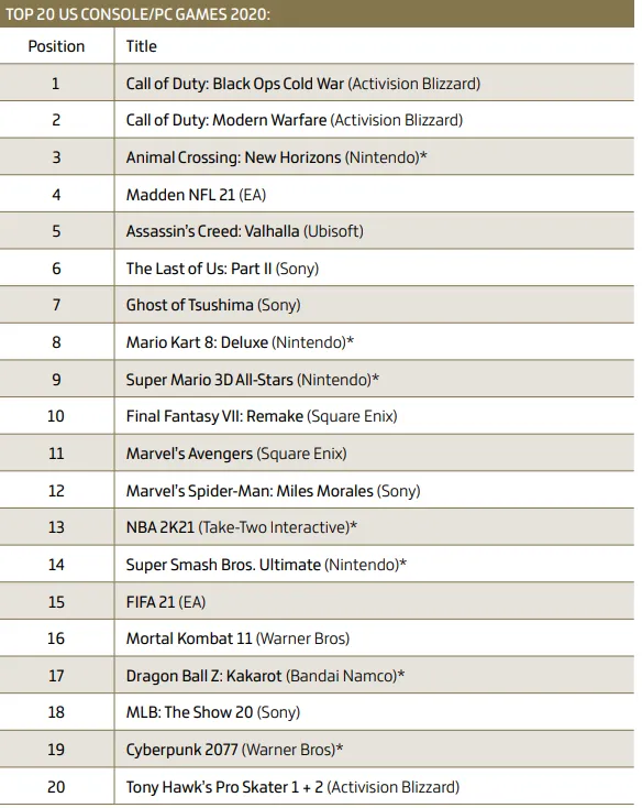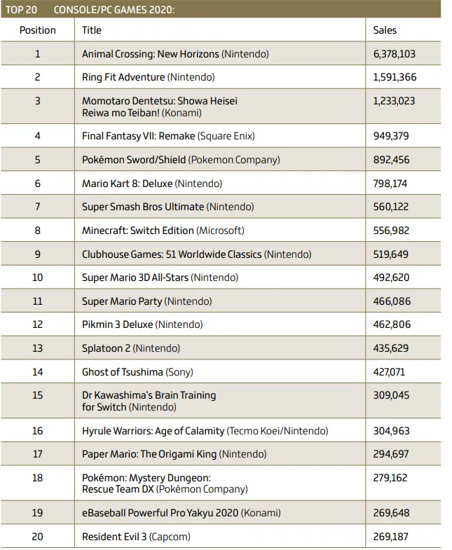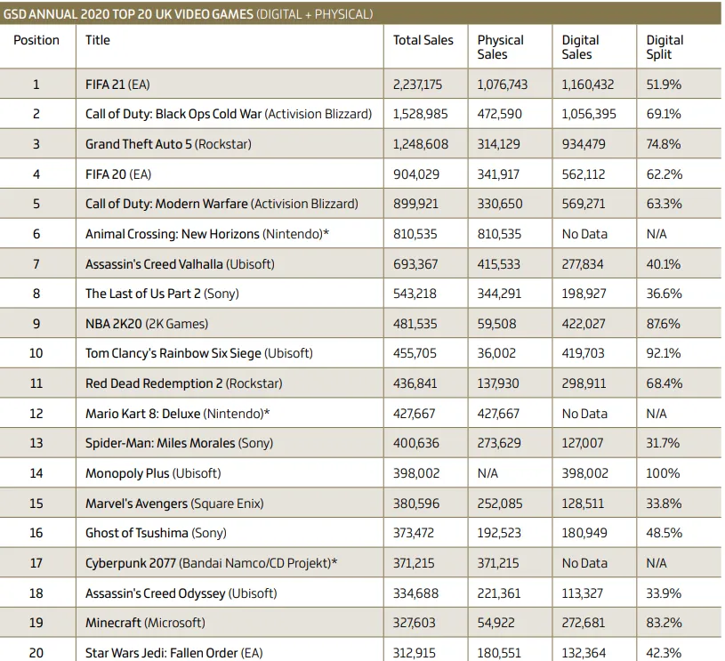Самым успешным издателем физических копий игр в 2020 году стала компания Nintendo, занявшая 20,5% от общего объёма продаж. На втором месте разместилась Electronic Arts с долей в 12,4%. В сфере цифровых продаж лидером стала Ubisoft, чья доля составила 18%. Electronic Arts снова оказалась на втором месте, контролируя 15% рынка.