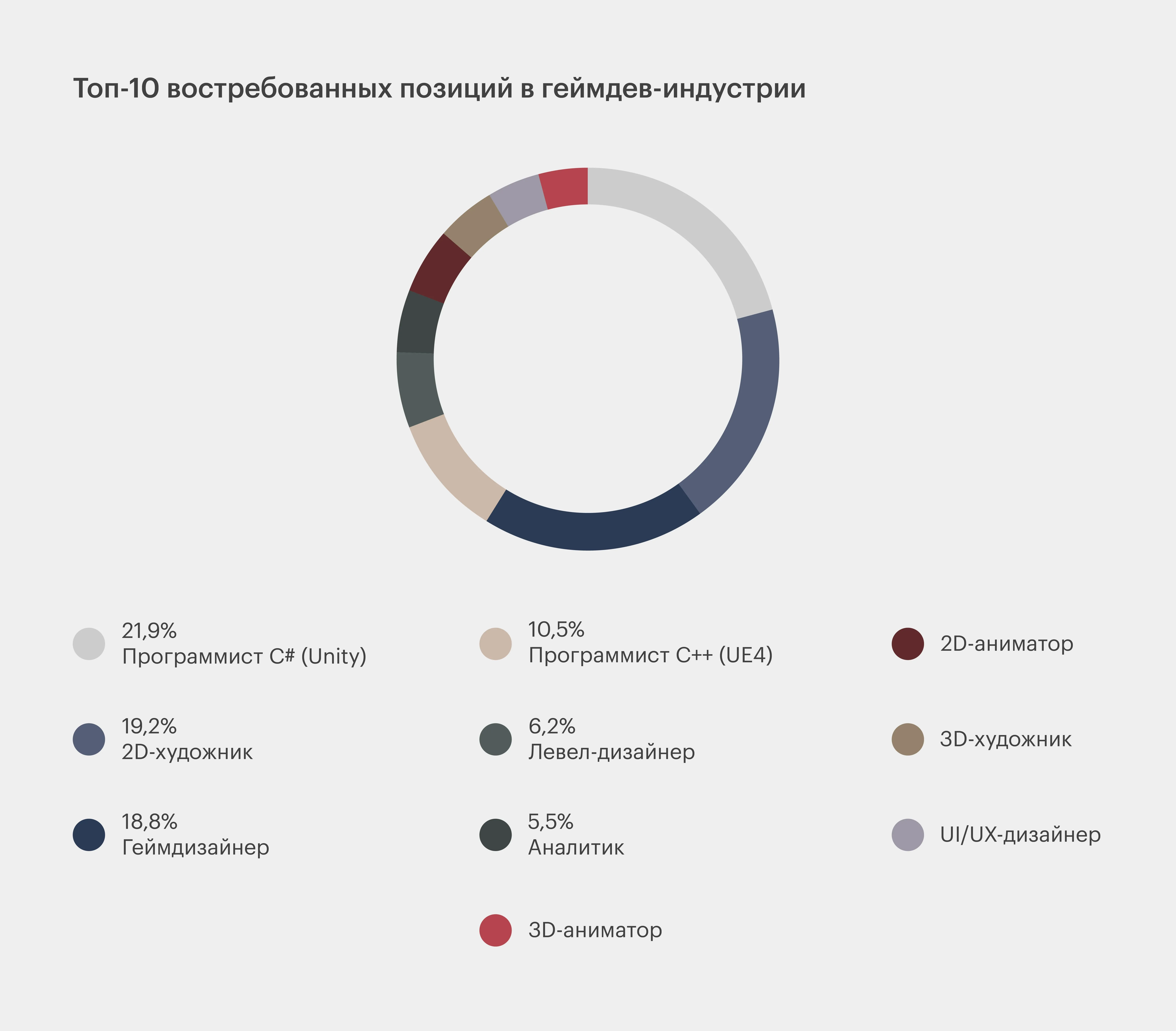 Согласно внутренней статистике GDJob.pro, в игровой индустрии наблюдается высокий спрос на специалистов в различных областях. Наибольшее количество вакансий открыто для программистов C# (Unity 3D) — 32,1%. Также значительное количество предложений предназначено для 2D-художников, доля которых составляет 19,2%, и геймдизайнеров с показателем 18,8%. Эти данные подчеркивают важность данных профессий в разработке игр и указывают на растущую потребность в квалифицированных кадрах в геймдеве.