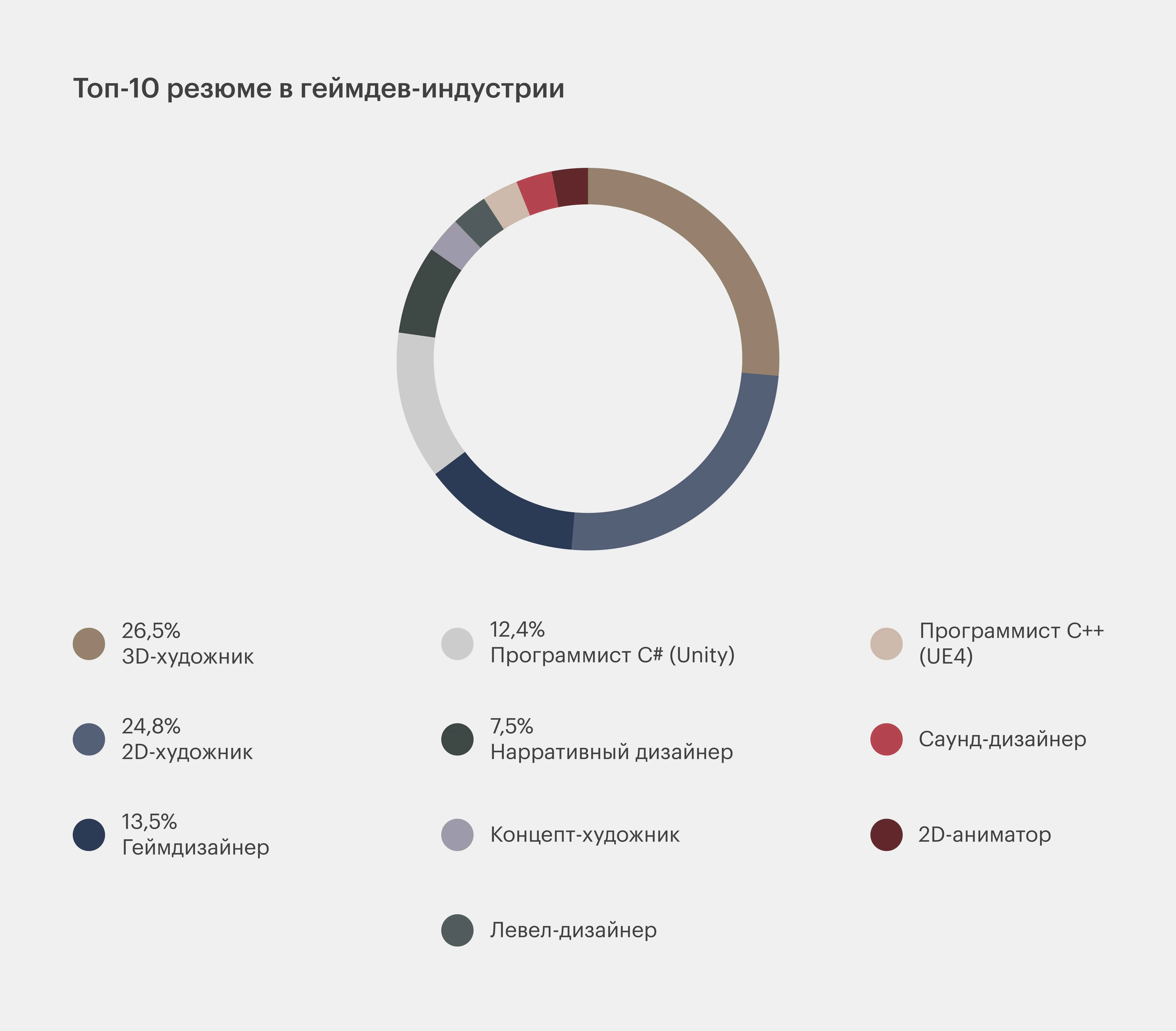 Спрос на специалистов в области геймдева практически соответствует предложению. Согласно статистике GDJob.pro, 2D-художники занимают второе место по количеству резюме, составляя 24,8% от общего числа. На третьем месте находятся геймдизайнеры с 13,5%. Однако наибольшее количество резюме принадлежит 3D-художникам, которые занимают 26,5% рынка. Эти данные подчеркивают важность 3D-искусства в разработке игр и растущий интерес к этой специальности со стороны работодателей.