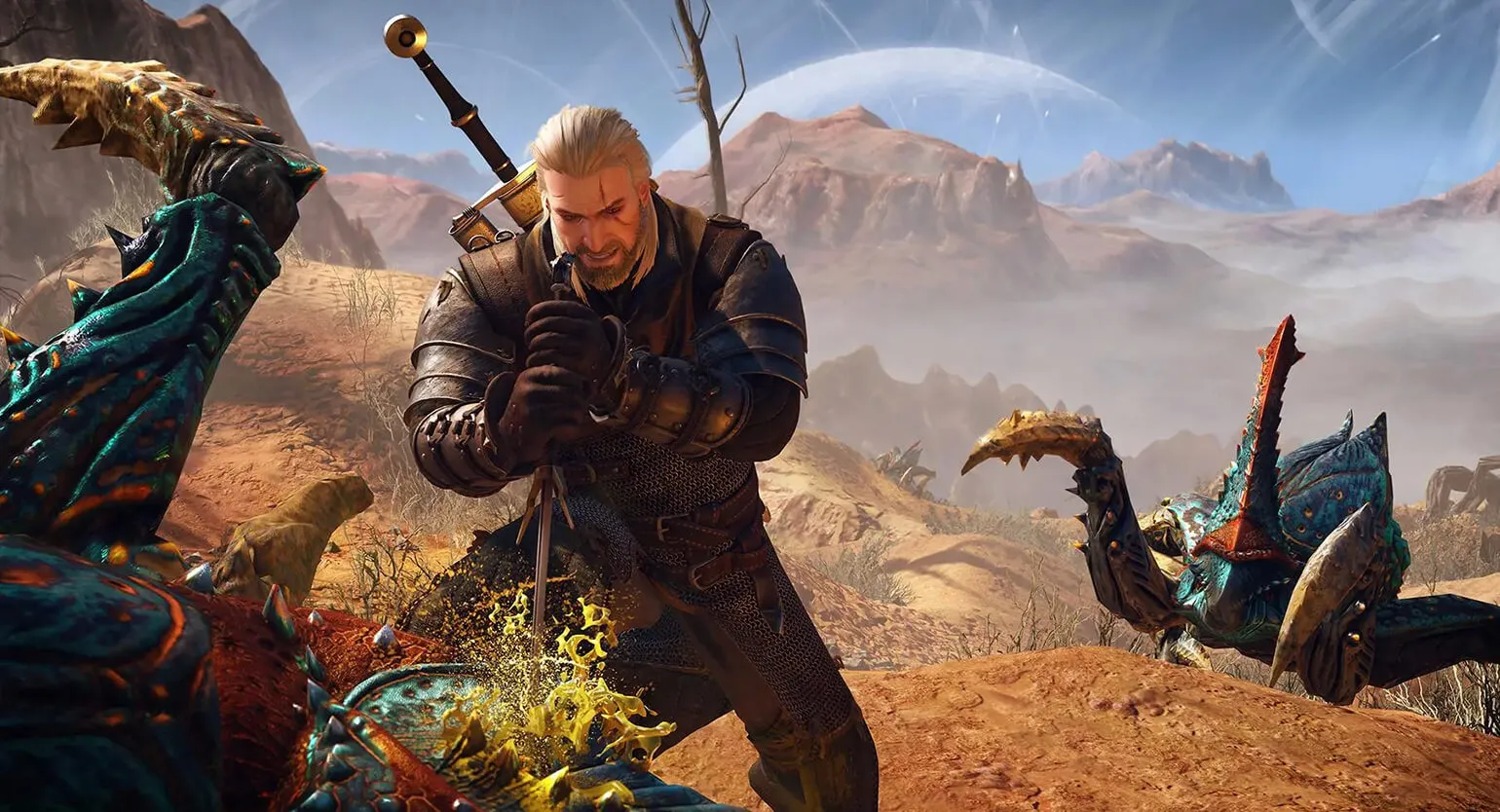 Серия игр «Ведьмак» является ярким примером гримдарка, представляя собой мрачную и реалистичную историю в мире, населенном разнообразными чудовищами, где самым опасным существом остается человек. Главный герой, ведьмак Геральт, блуждает по болотам Велена, сражаясь с накерами и утопцами, которые в лучшем случае уносят жизни нескольких десятков человек в год. В то время как он занимается этими мелкими угрозами, регион страдает от последствий третьей войны Северных королевств с Нильфгаардом, уносящей десятки тысяч жизней. Эта контрастная динамика между личными конфликтами Геральта и масштабными военными катастрофами создает уникальную атмосферу, характерную для произведений гримдарка.