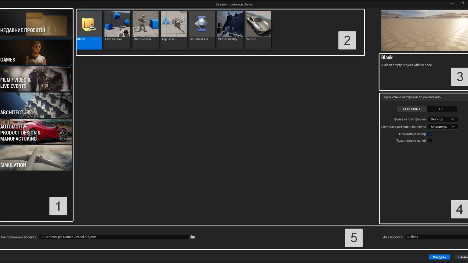 В области №1 представлено пять категорий шаблонов, а также секция «Недавние проекты» (Recent Projects). Здесь вы можете просмотреть ранее созданные вами проекты, включая те, что были разработаны на Unreal Engine 4. Эти проекты также отображаются в «Библиотеке» лаунчера Epic Games. При открытии этой вкладки в нижнем левом углу вы найдете опцию «Всегда загружать последний проект при запуске» (Always load last project on startup). Если вы активируете эту функцию, редактор будет автоматически загружать последний открытый проект при каждом запуске, что значительно упростит вашу работу и сэкономит время.