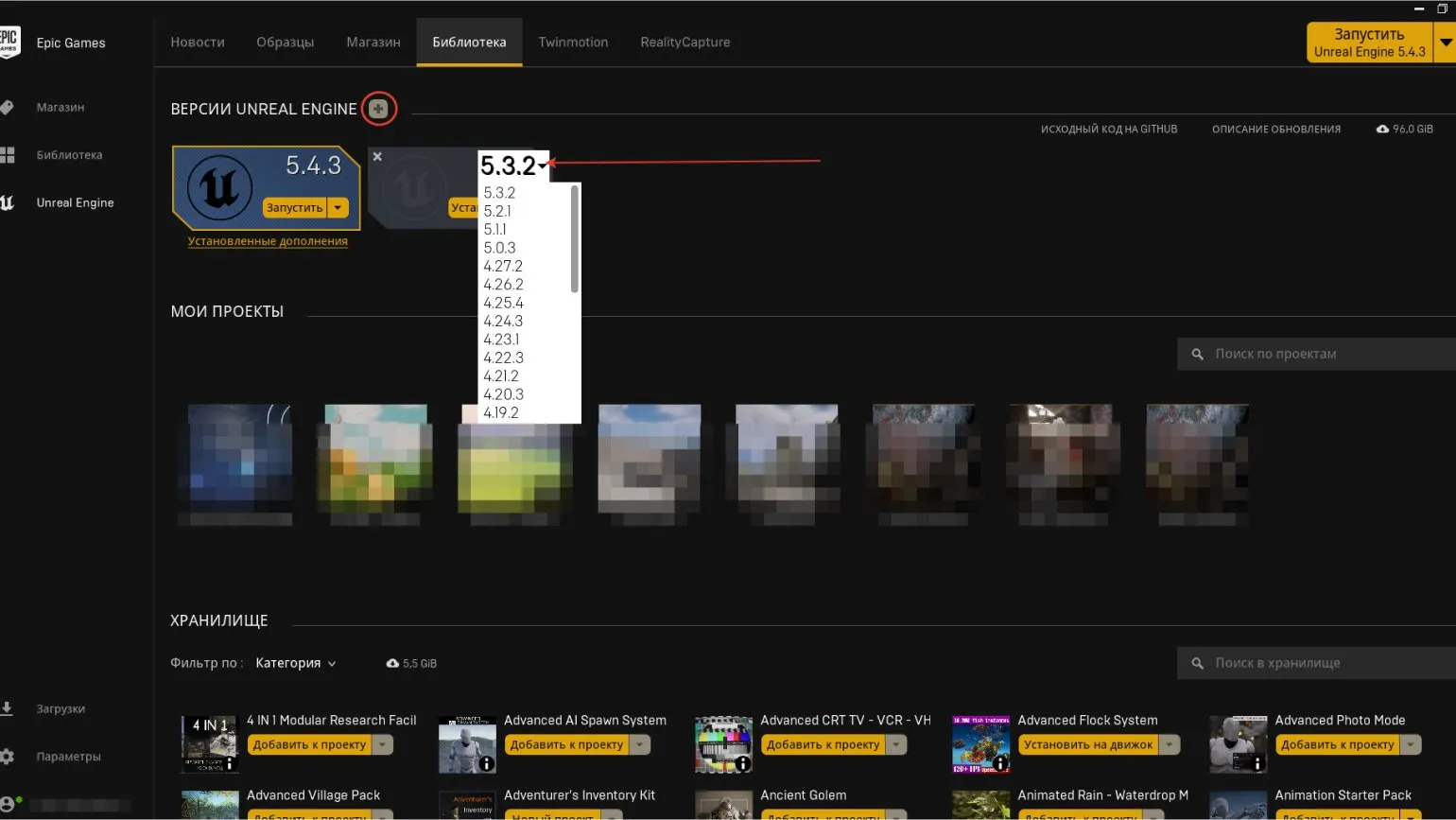По умолчанию клиент автоматически устанавливает последнюю версию движка Unreal Engine. Однако, если возникает необходимость использовать более раннюю версию, например, Unreal Engine 4, необходимо нажать кнопку «Установить новую версию Unreal Engine» (иконка +). В меню появится новый слот для версии. Нажмите на стрелку рядом с номером версии, чтобы открыть вкладку с полным списком доступных сборок. Выберите нужную версию и нажмите «Установить». Этот процесс позволяет легко управлять версиями Unreal Engine и обеспечивает доступ к необходимым инструментам для разработки.