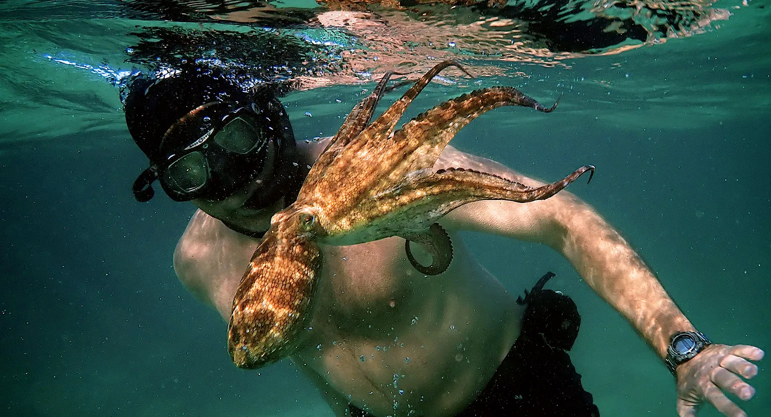 Режиссёр-документалист Крэйг Фостер, столкнувшись с творческим кризисом, решает вернуться к своему детскому увлечению — фридайвингу. Каждый день он погружается в океан, пока однажды не встречает молодого осьминога, который прячется среди водорослей. Фостер с удивлением осознаёт, что это маленькое существо обладает гораздо более развитым интеллектом, чем он ожидал. Постепенно ему удаётся завоевать доверие осьминога, что открывает дверь к уникальному взаимодействию между человеком и животным. Этот опыт не только помогает Фостеру преодолеть творческий кризис, но и углубляет его понимание морской жизни и экосистемы океана.