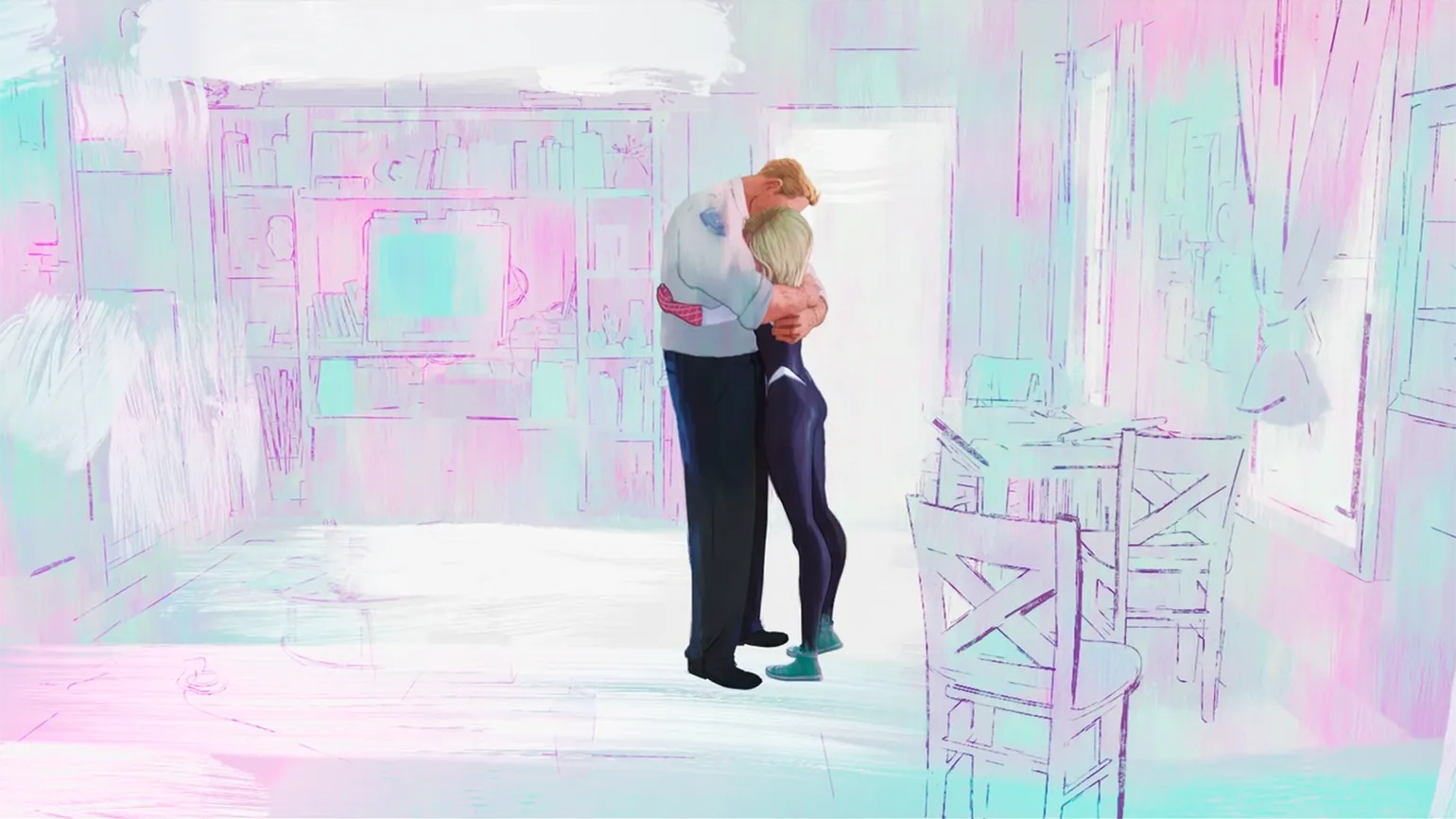 Важной сценой в сюжете является воссоединение Гвен с её отцом. Здесь мы видим не просто супергероиню и полицейского, а родителя и ребёнка, которые сталкиваются с трудностями в понимании друг друга. Этот момент сосредоточен на их диалоге, который становится центральным элементом сцены. Все окружающее кажется размытым, служа фоном для их общения. Цвета постоянно меняются, а краска словно стекает со стен, подчеркивая эмоциональную напряженность и динамику их разговора. Сцена демонстрирует глубину отношений и сложность взаимодействия, что делает её ключевой в развитии сюжета.
