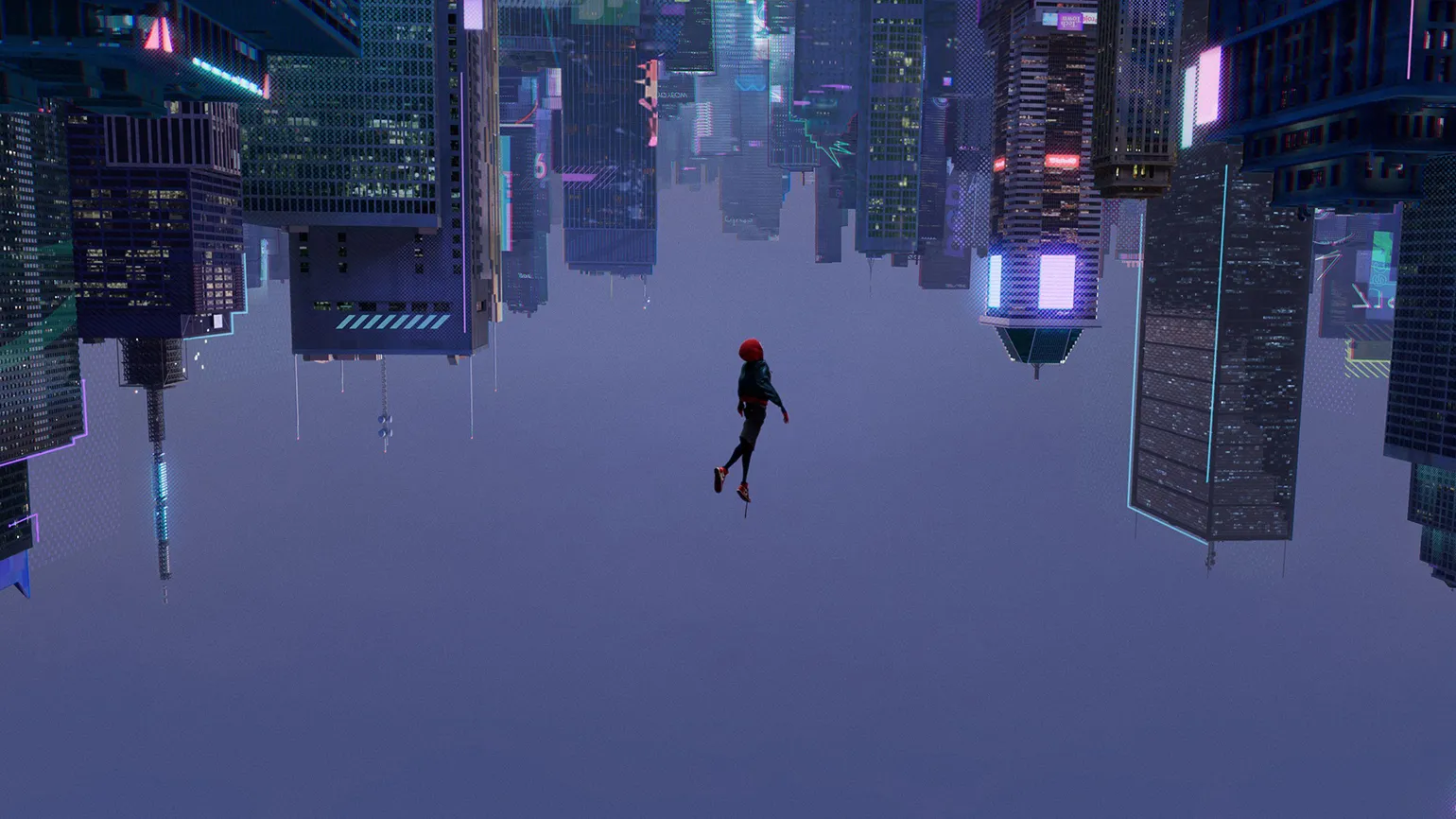 Майлз, получивший свои суперспособности от укуса паука, поначалу не осознает своего потенциала и вместо полета без конца падает. Анимация в этих сценах схожа с моментами диалогов и повседневной жизни — она прерывистая из-за уменьшенного количества кадров в секунду и слегка размыта. Город выглядит как яркое и многоцветное марево. Падения Моралеса достигают своего предела с гибелью Питера Паркера. Для Майлза это момент полной потери, когда падать уже некуда. Единственный путь, который остается, — это подъем к новым высотам.