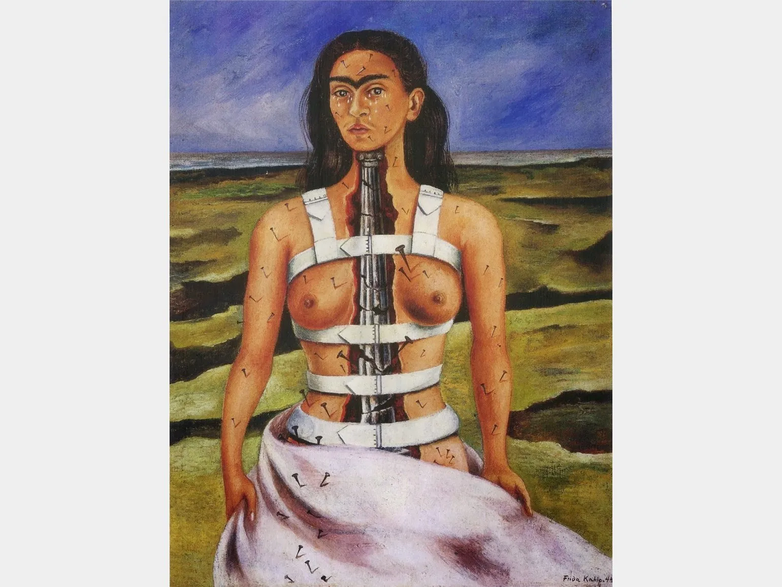 Сломанный позвоночник Фриды Кало символизирует ионическую колонну, разрушающуюся на линии разлома в её теле. Вместо металлического корсета, который ей приходилось носить из-за хронической боли в спине, на холсте художница обвязывает себя белыми бинтами. На автопортрете Кало предстает в состоянии уязвимости, однако при этом она демонстрирует свою внутреннюю силу, которая не поддается даже физическим недугам. Этот образ подчеркивает противоречие между её физическим страданием и стойкостью духа, что делает работу особенно глубоким и эмоциональным произведением искусства.