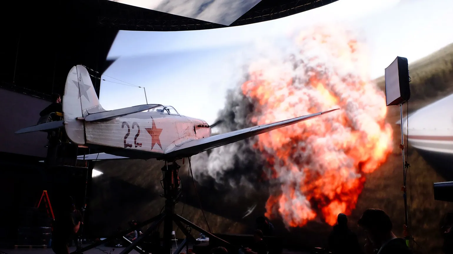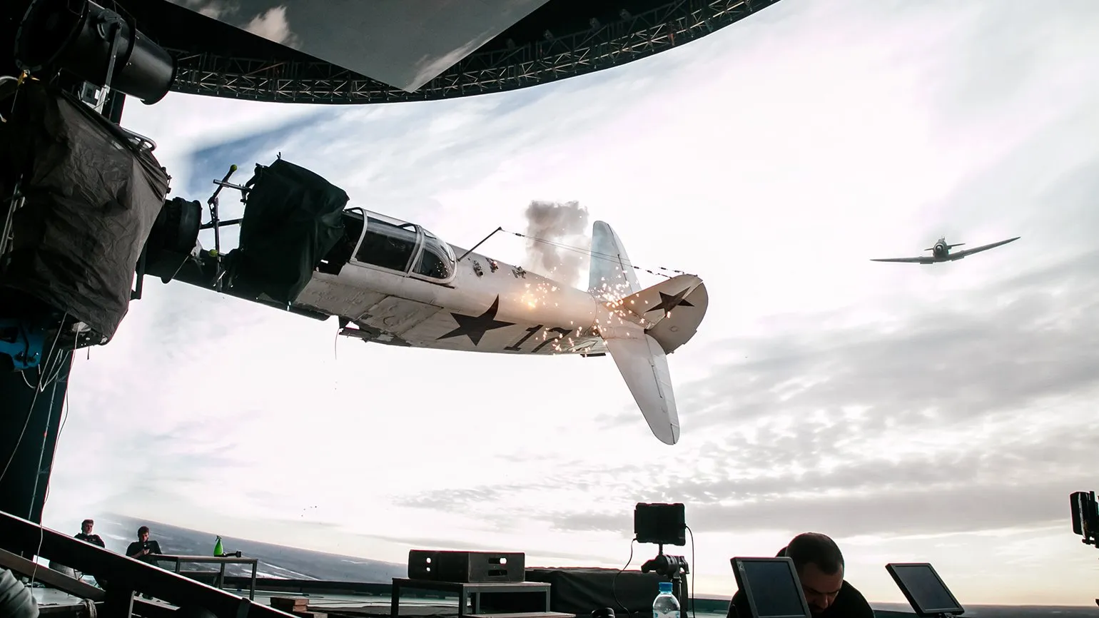 Для съемки боевых сцен мы применяли аналогичную технологию. К примеру, реальный самолет находится на экране в хвостовом положении, и мы создаем эффект, как будто наблюдаем за ним сзади. На экране демонстрируется 3D-модель самолета, которая выпускает виртуальные пули в сторону настоящего самолета. В этот момент на фюзеляже реального самолета активируется пиротехнический эффект. Этот синтез реалистично выглядит и порой даже нам сложно отличить виртуальный самолет от реального. Такой подход значительно усиливает визуальное восприятие и создает уникальный опыт для зрителей.