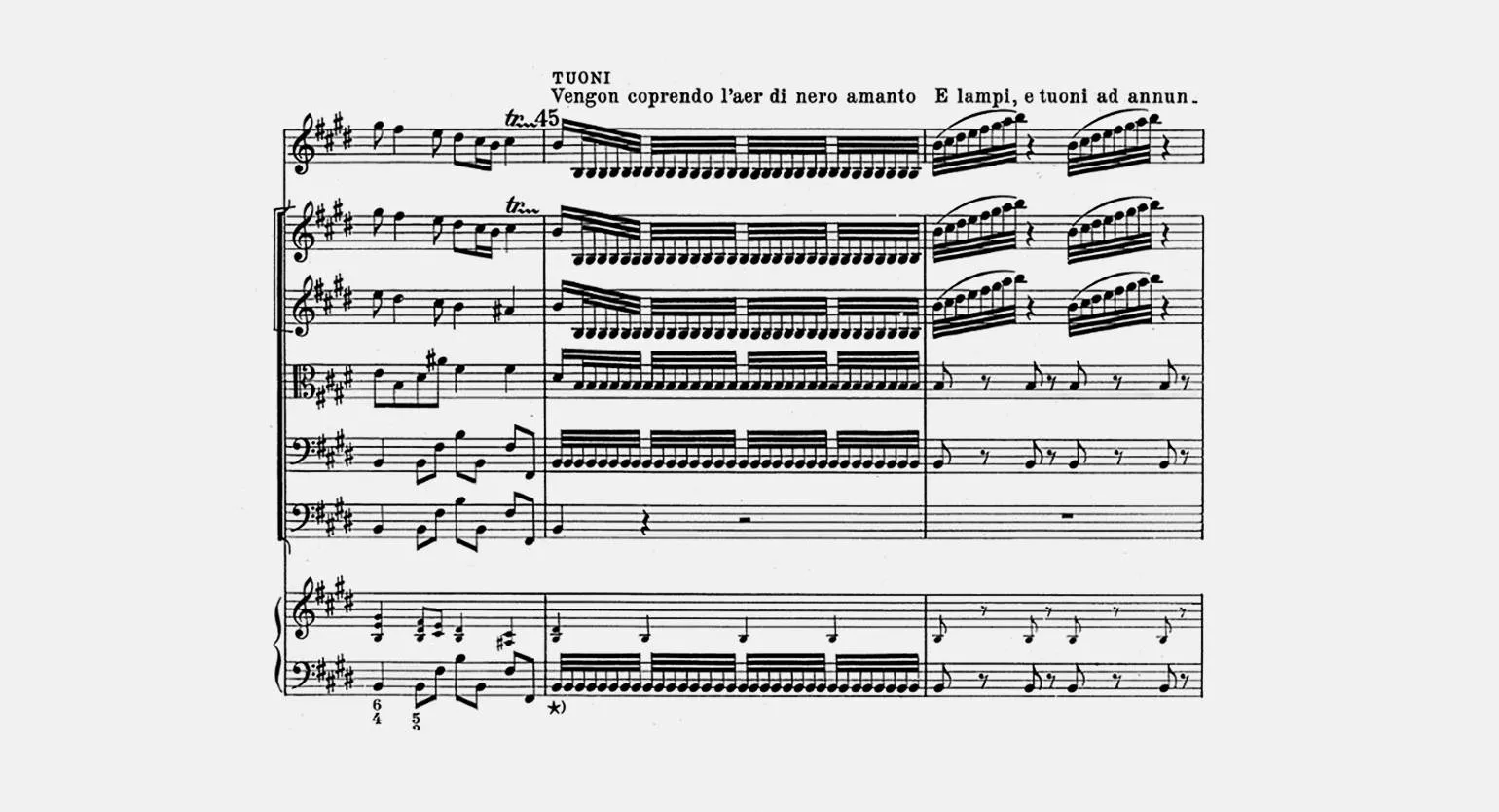 Повторяющиеся ноты в быстром темпе создают эффект отголосков грома, напоминая звучание грозы. Пассажи, стремящиеся вверх, ассоциируются с молниями, ярко вспыхивающими в небе. Этот музыкальный подход передает динамику и напряжение, создавая ощущение мощи природных явлений.