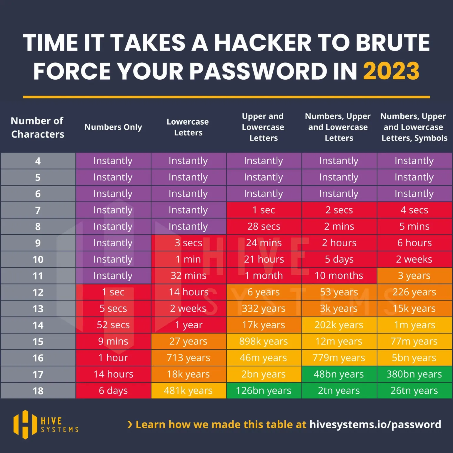 Для защиты Ваших аккаунтов крайне важно использовать надежные и сложные пароли. Исследования компании по кибербезопасности Hive Systems демонстрируют, сколько времени необходимо для взлома паролей в зависимости от их сложности. Чем более сложный пароль, тем больше времени потребуется злоумышленнику для его взлома. Использование уникальных комбинаций символов, цифр и букв различного регистра значительно повышает уровень безопасности. Это поможет минимизировать риск несанкционированного доступа к вашим личным данным и аккаунтам.