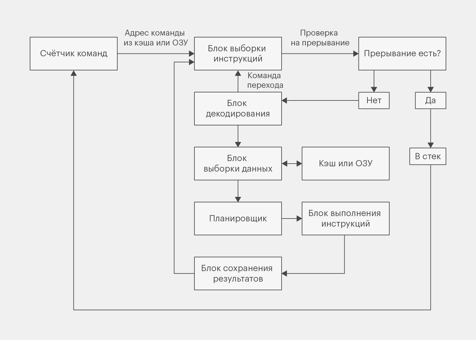Блок выборки инструкций начинается с проверки наличия прерываний, которые могут возникать по различным причинам, например, из-за ввода данных с клавиатуры или получения информации по сети. В случае обнаружения прерывания регистры и счётчик команд сохраняются в стек. Затем в счётчик команд записывается адрес соответствующего обработчика прерываний. После завершения обработки прерывания данные восстанавливаются, что позволяет системе продолжить выполнение предыдущих задач без потери информации.