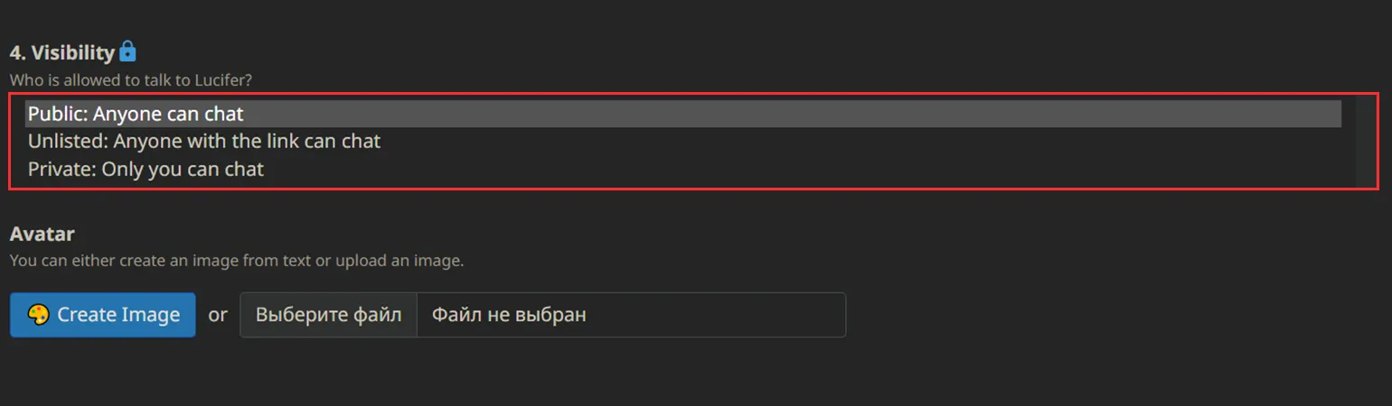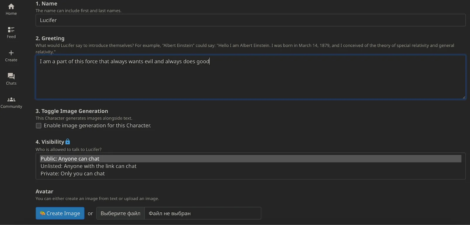 Заполните форму, указав имя для вашего персонажа, загрузив соответствующий аватар и написав приветственное сообщение. Например, для создания персонажа Люцифера можно использовать цитату из произведения ‘Фауст’. Это поможет сделать вашего героя более запоминающимся и уникальным. Не забудьте, что правильно подобранное имя и аватар играют ключевую роль в создании образа персонажа и привлечении интереса к нему.
