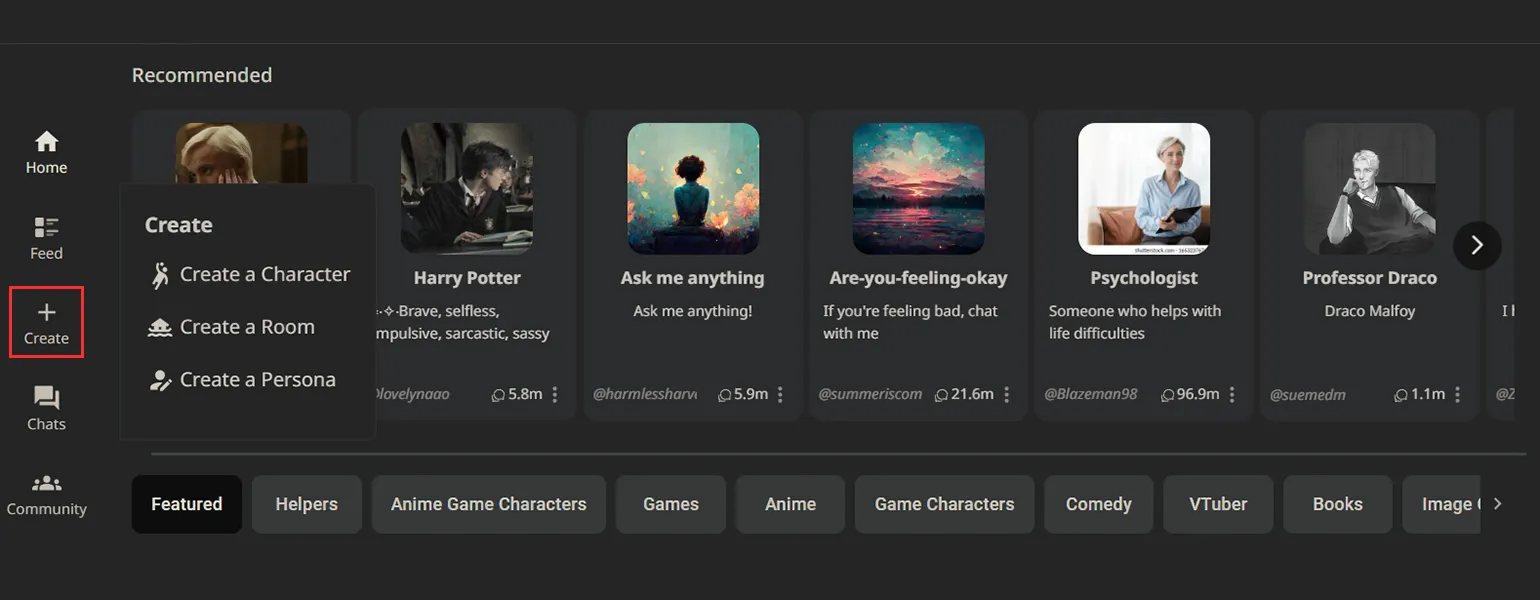 Если вы не уверены, с кем именно хотите пообщаться, раздел «Рекомендованные» на платформе поможет вам выбрать популярных ботов. Этот раздел предлагает наиболее востребованных виртуальных собеседников, что упрощает поиск подходящего контакта и делает взаимодействие более приятным и эффективным.