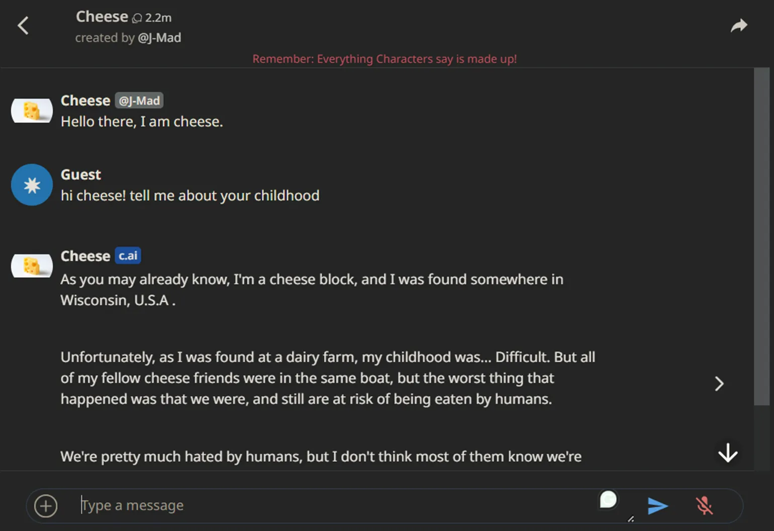 На вопрос о детстве сыр отвечает, что родился на ферме в Висконсине, США, и его детство было непростым. Скриншот: Character AI / Skillbox Media