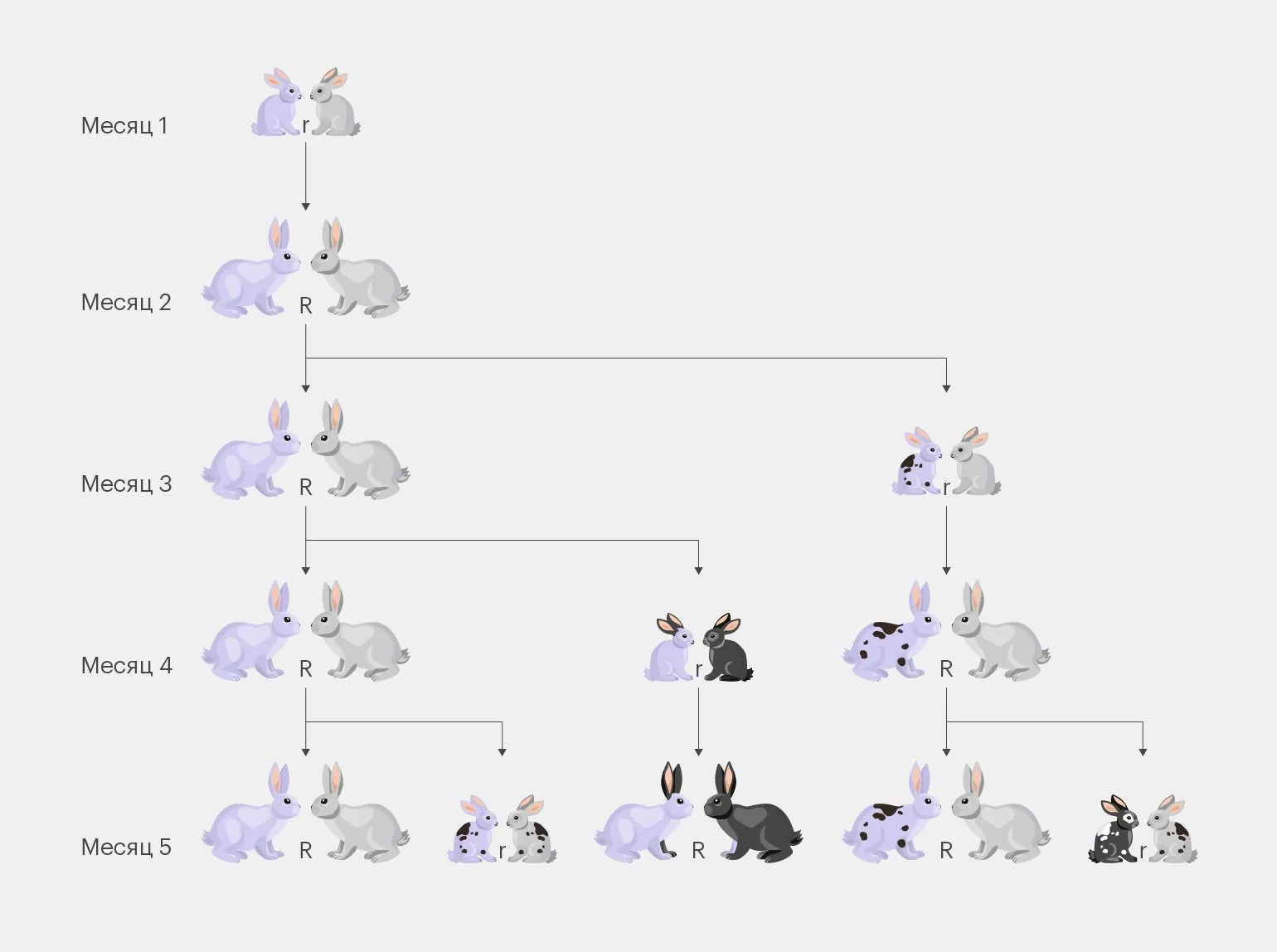 Сначала пара молодых кроликов не может размножаться. Однако через месяц они достигают половой зрелости, и на третий месяц в загоне появится уже две пары. В дальнейшем количество пар будет увеличиваться по принципу, при котором общее число пар в текущем месяце будет равно сумме пар за два предыдущих месяца. Эта последовательность напоминает известную числовую последовательность Фибоначчи. Таким образом, размножение кроликов демонстрирует экспоненциальный рост численности, что важно учитывать при планировании содержания и кормления животных.