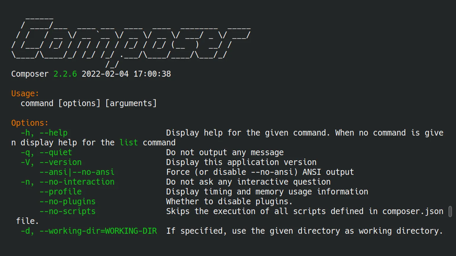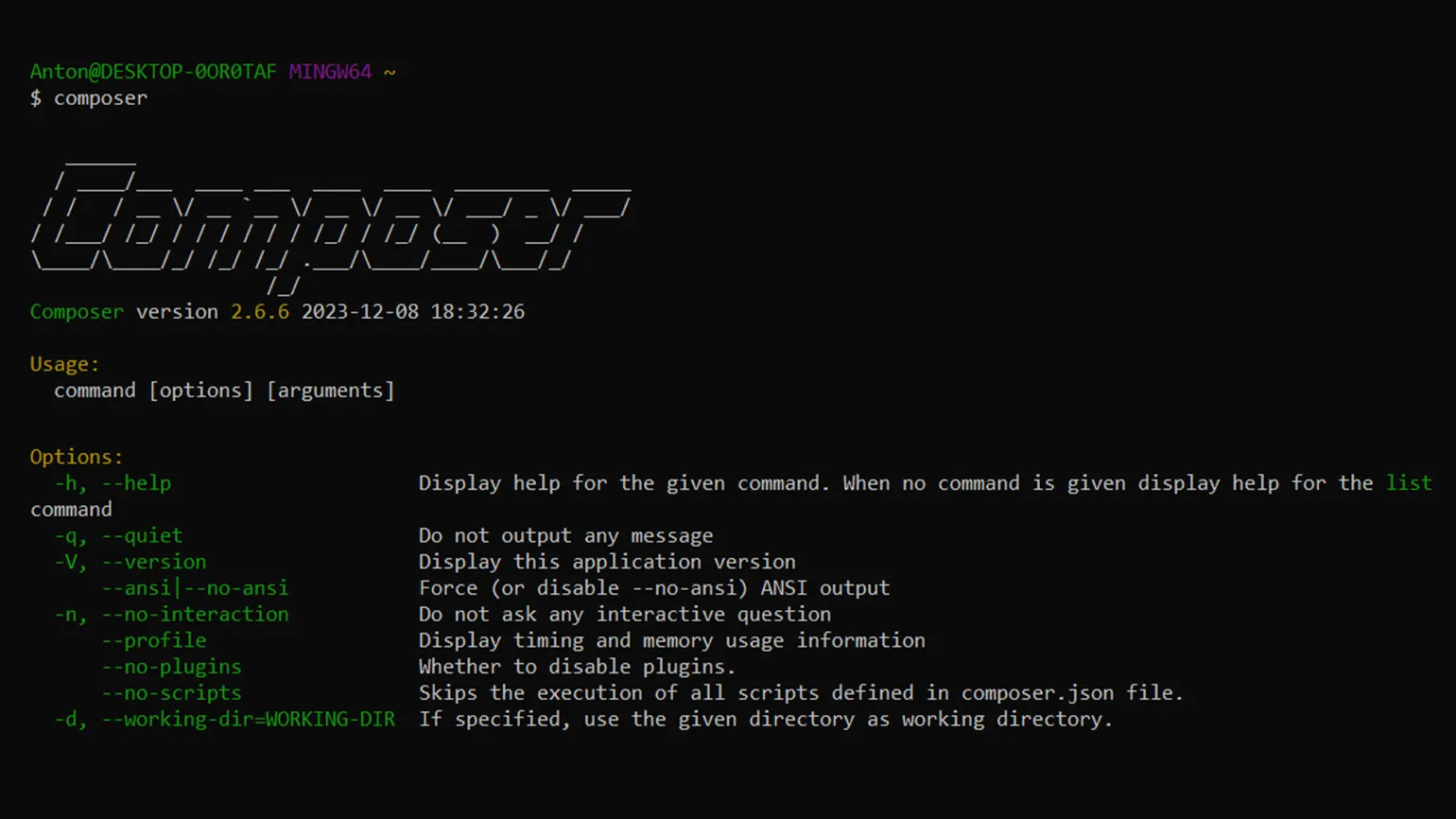 - Проверьте установку, введя команду ‘composer’ в терминале и убедитесь, что выводится сообщение о успешной установке.