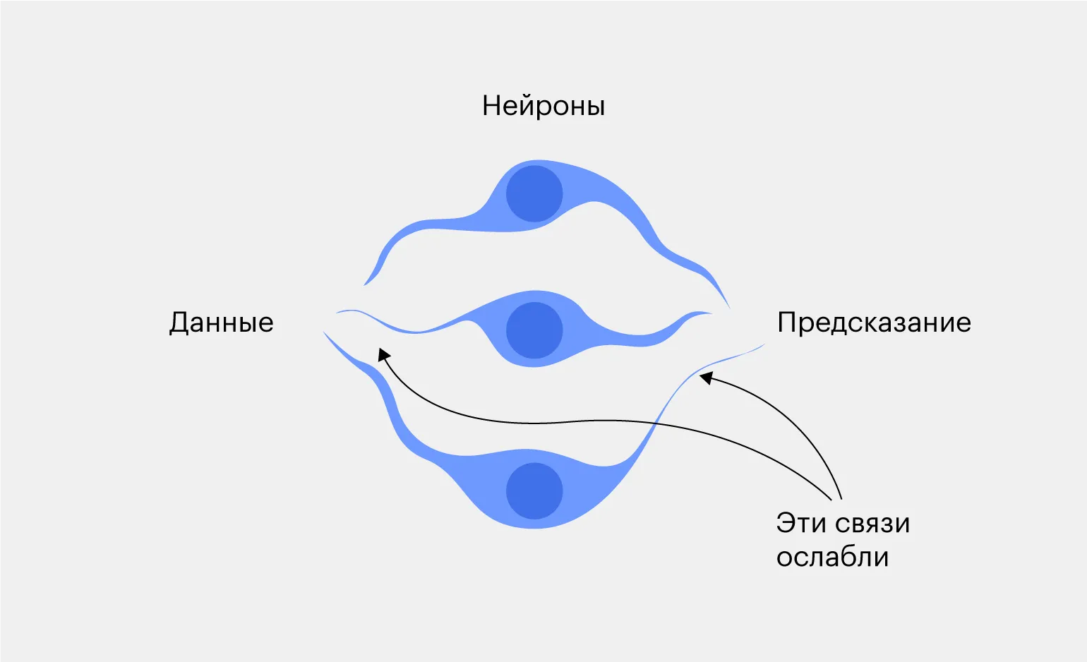 Для улучшения результатов необходимо ослабить воздействие нейронов, которые способствовали ошибочному выводу. Этот процесс можно рассматривать как своего рода механическое «наказание», направленное на коррекцию неправильных предсказаний и оптимизацию работы нейронной сети.