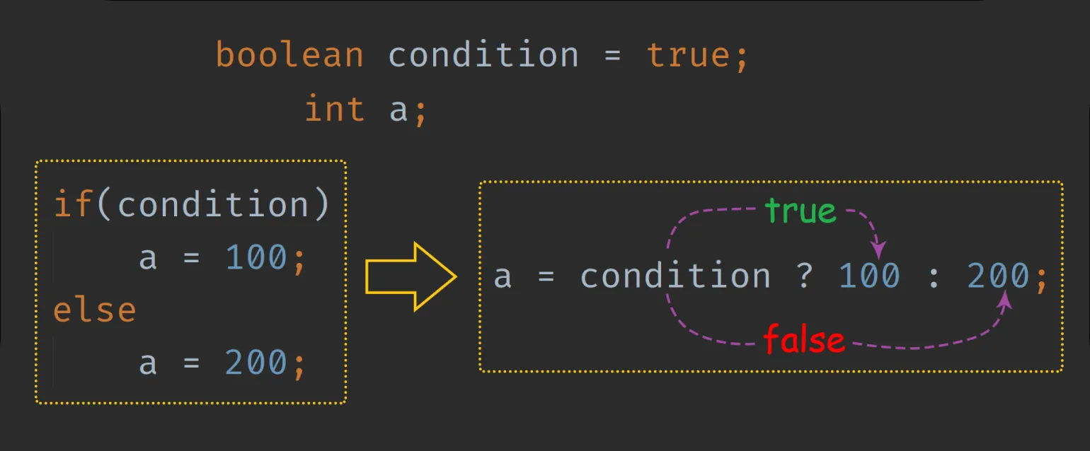 Суть заключается в том, что мы можем записать конструкцию if-else в одну строку с использованием тернарного оператора. Например, если нам необходимо проверить булеву переменную condition, и в зависимости от её значения присвоить переменной a значение 100, когда condition истинно (true), или 200, когда condition ложно (false), это можно сделать очень просто. Пример использования тернарного оператора для этой задачи выглядит следующим образом: