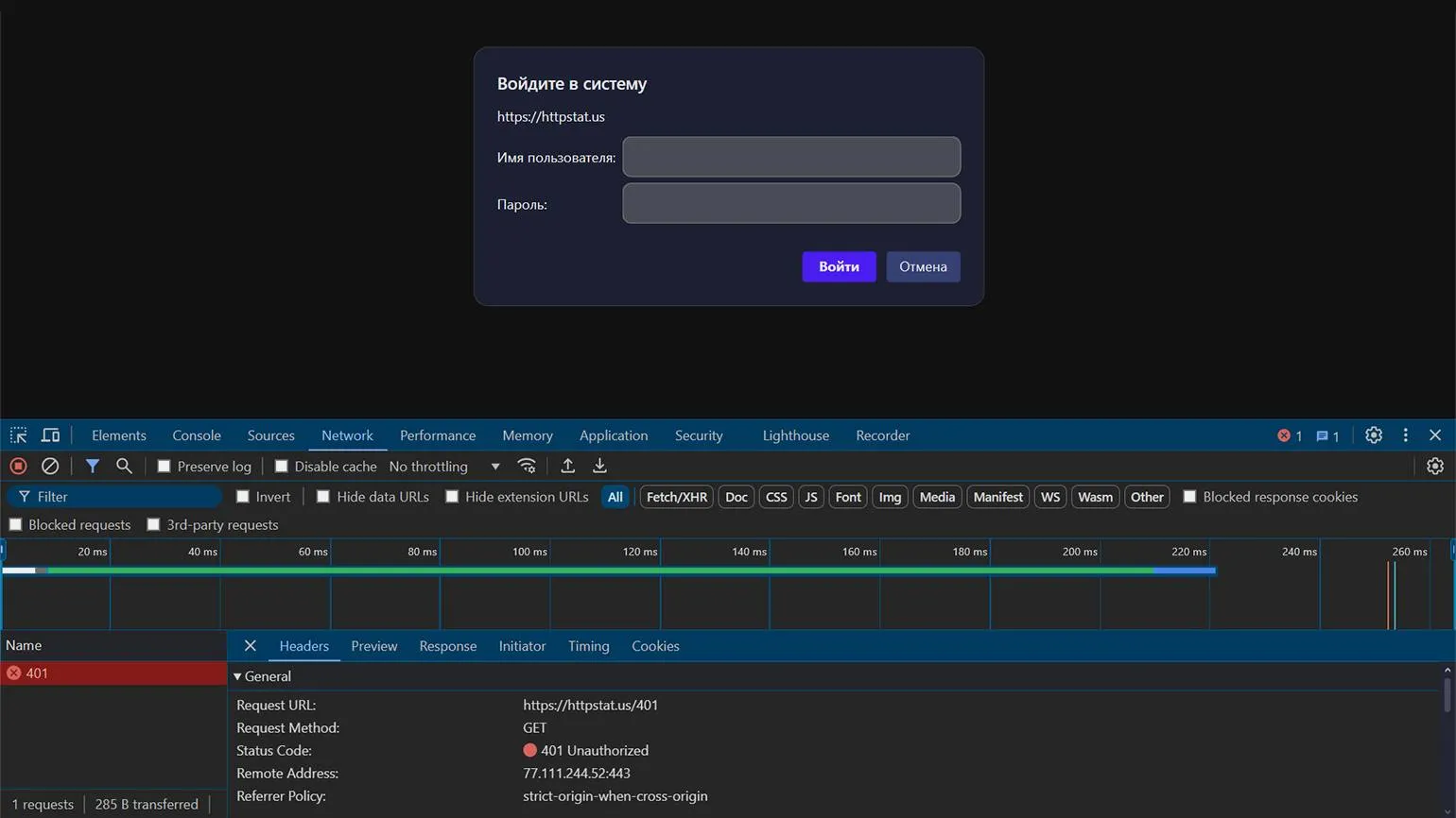 Для того чтобы ознакомиться с ошибкой 401, воспользуйтесь сервисом httpstat.us. Перейдя по ссылке httpstat.us/401, вы увидите стандартное диалоговое окно, запрашивающее ввод логина и пароля. Введите произвольные данные, и сервис их отклонит, возвращая ошибку 401 без явного предупреждения на странице. Это иллюстрирует, как сервер обрабатывает несанкционированные запросы, не предоставляя пользователю дополнительной информации.