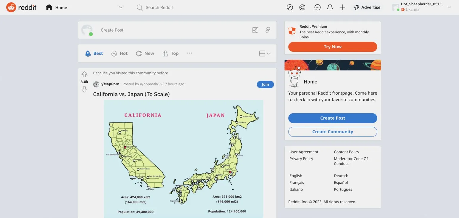 - Hot («Горячее») — подборка свежих постов, которые получили много лайков и комментариев. Авторизованный пользователь видит больше сообщений из сабреддитов, на которые подписан. Есть также дополнительный фильтр по странам.