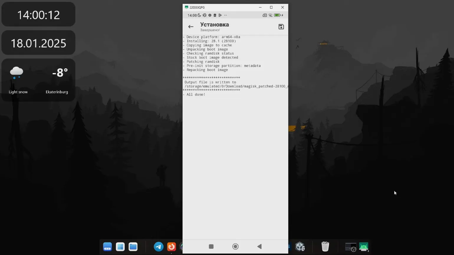 По окончании процесса вы увидите сообщение «All done!». Файл patched_boot.img будет сохранён в папке Загрузки. Для дальнейшего использования его необходимо перенести на компьютер. Это можно сделать с помощью USB-кабеля или через облачное хранилище.