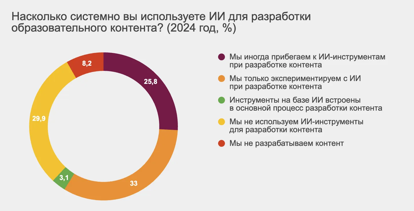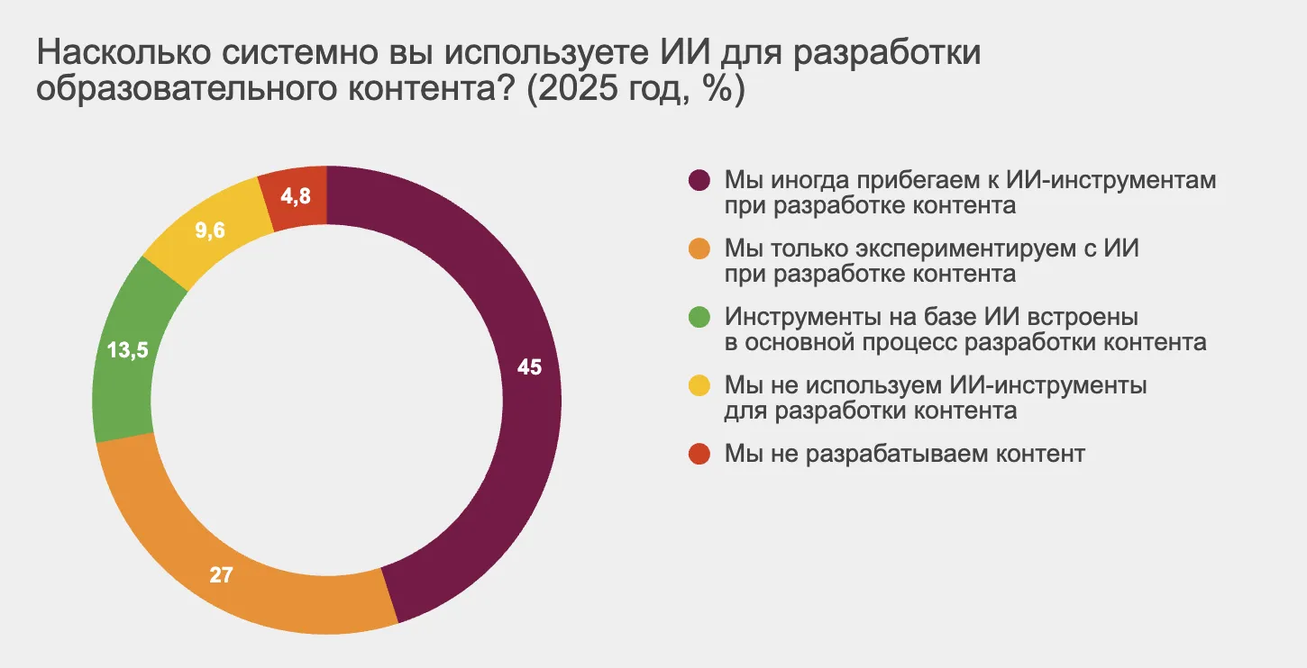 За последний год значительно увеличилась доля компаний, которые активно интегрируют инструменты искусственного интеллекта в процесс разработки курсов для сотрудников, с 3,1% до 13,5%. Почти половина опрошенных использует ИИ периодически для решения конкретных задач, в то время как 27% организаций только начинают экспериментировать с этой новой технологией. Всего 9,6% компаний не применяют искусственный интеллект в создании контента, что является значительным снижением по сравнению с прошлым годом, когда этот показатель составлял 29,9%. Интеграция ИИ в образовательные процессы позволяет повысить эффективность обучения и адаптировать материалы под нужды сотрудников.