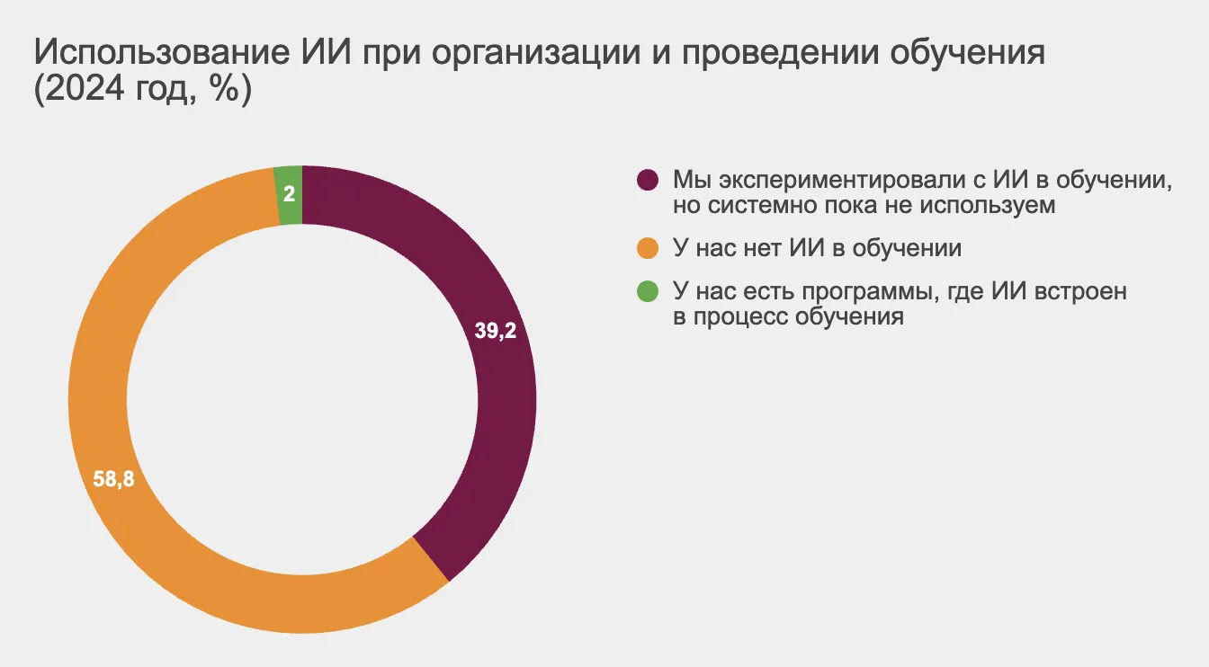 В течение года доля компаний, активно внедряющих искусственный интеллект в процесс обучения сотрудников, увеличилась более чем в три раза — с 2% до 7%. Тем не менее, 42% опрошенных организаций по-прежнему не используют ИИ в своих образовательных программах. Это свидетельствует о необходимости повышения осведомленности о преимуществах технологий ИИ и их внедрении в корпоративное обучение.