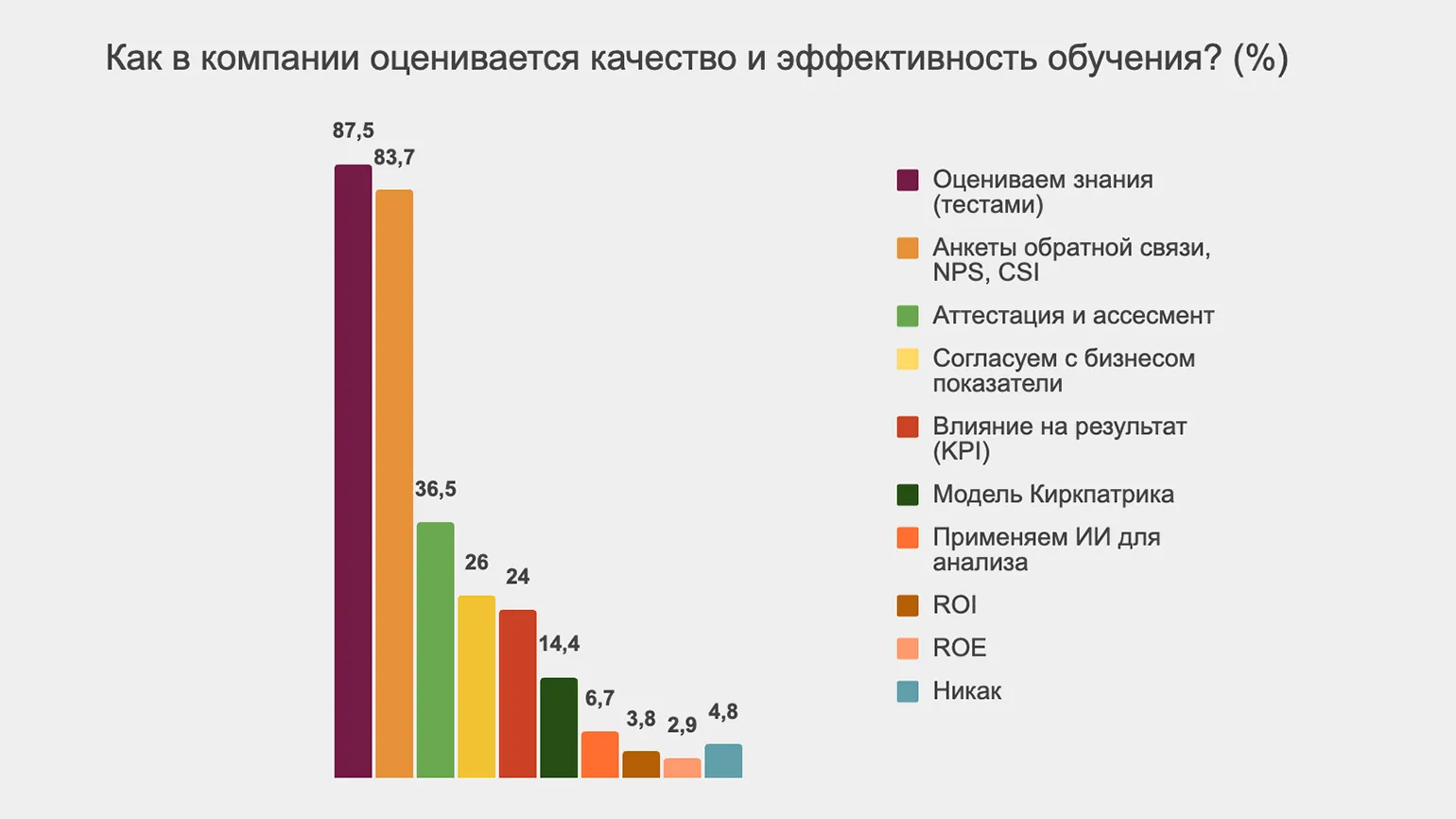 Недавние исследования указывают на то, что оценка эффективности обучения стала более важной для компаний в последние два года. В 2025 году большинство респондентов отметили, что для оценки знаний сотрудников используются тесты (87,5%). Кроме того, для измерения удовлетворенности сотрудников опытом обучения применяются анкеты обратной связи, а также метрики NPS и CSI (83,7%). Эти данные подчеркивают растущую значимость систематического подхода к обучению и его результатам, что позволяет компаниям повышать качество образования и вовлеченность сотрудников.