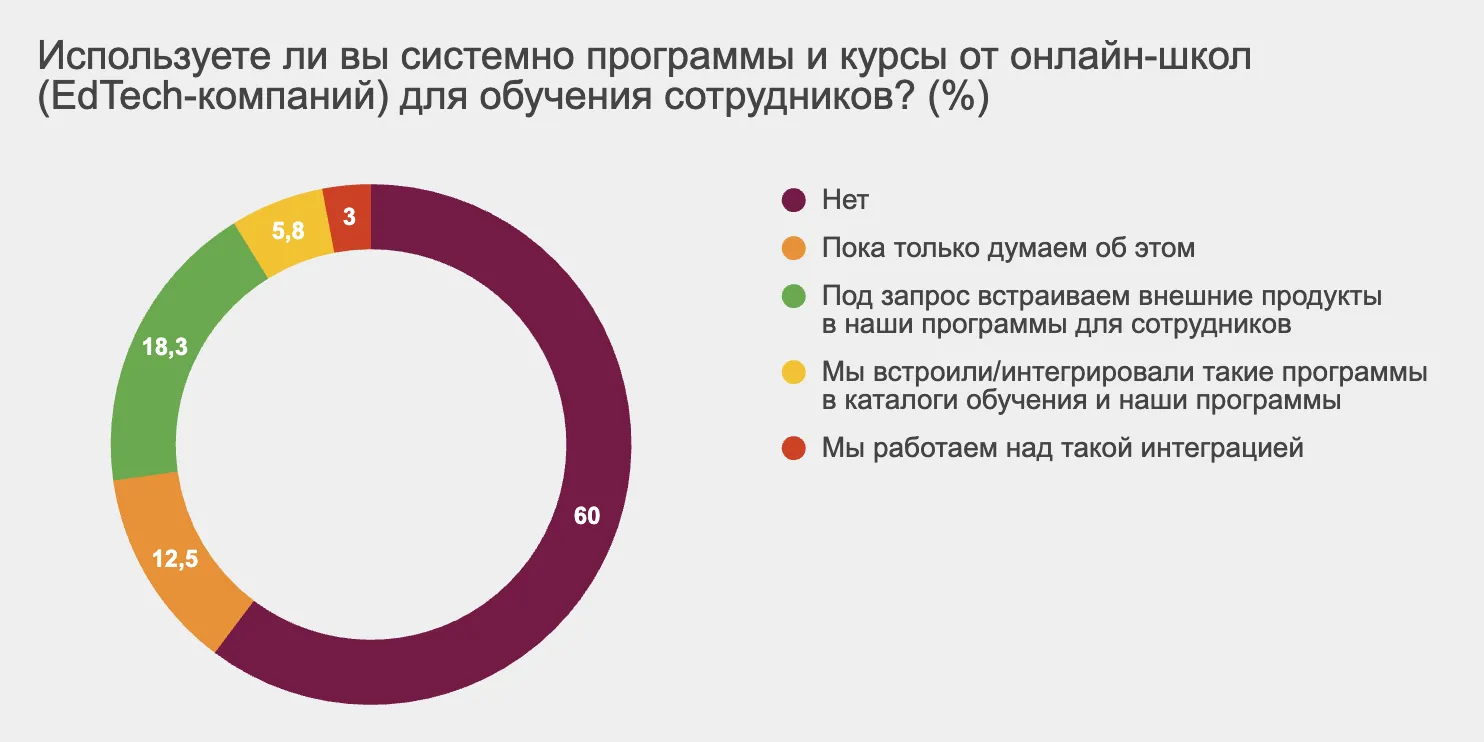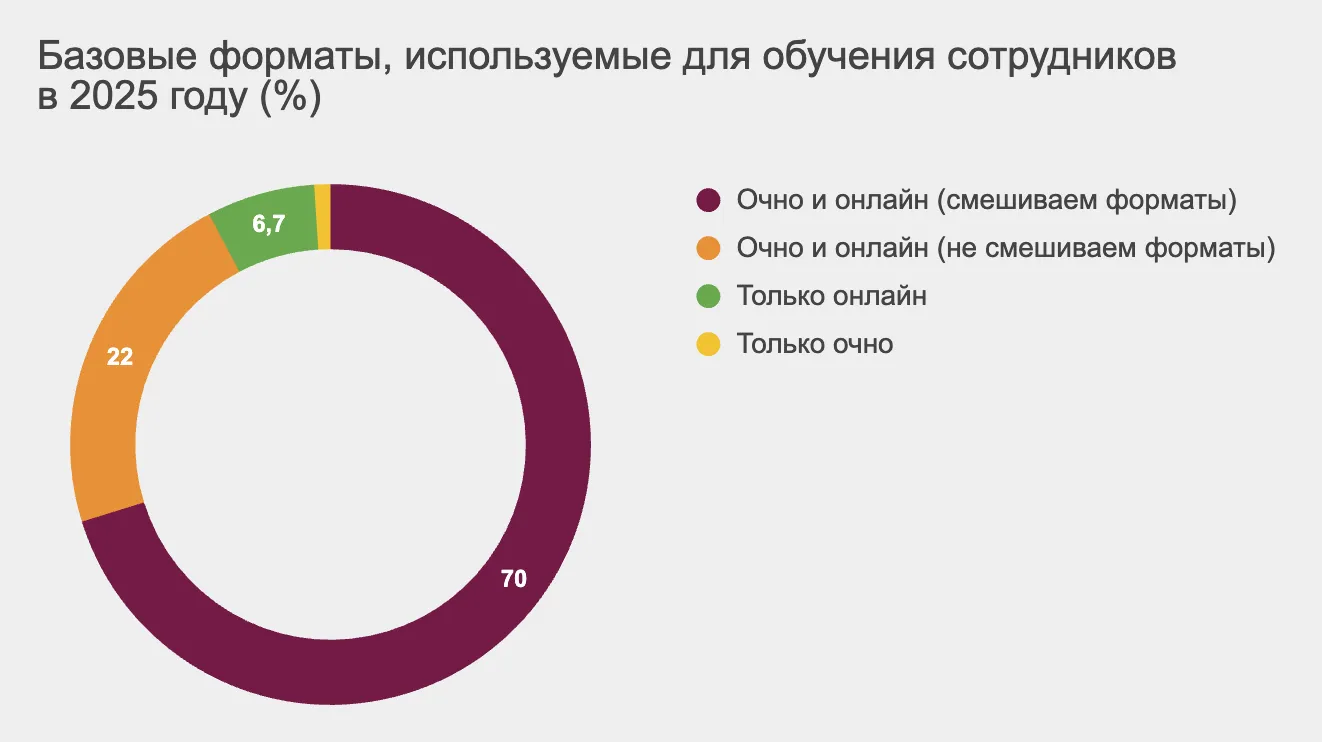 Доля компаний, которые полностью переходят на онлайн-обучение своего персонала, снизилась с 9,3% в 2024 году до 6,7% в 2025 году. Также уменьшилось количество организаций, выбирающих исключительно очное обучение, с 3% до 1%. Эти изменения подчеркивают тенденцию к снижению интереса к традиционным методам обучения и указывают на необходимость адаптации образовательных программ к современным требованиям.